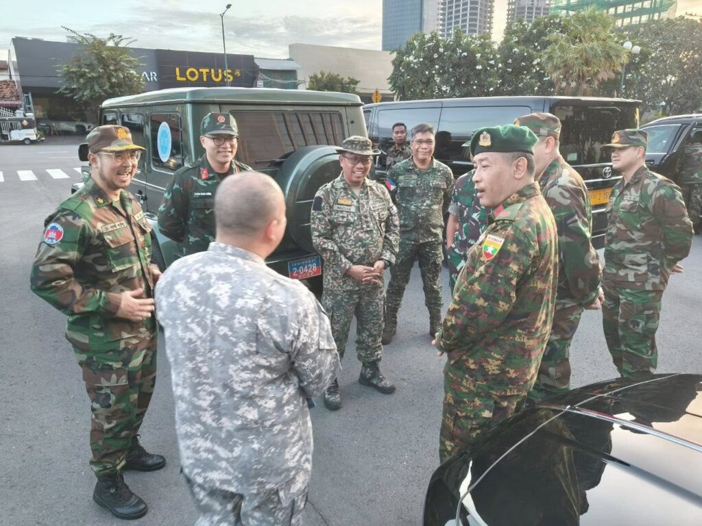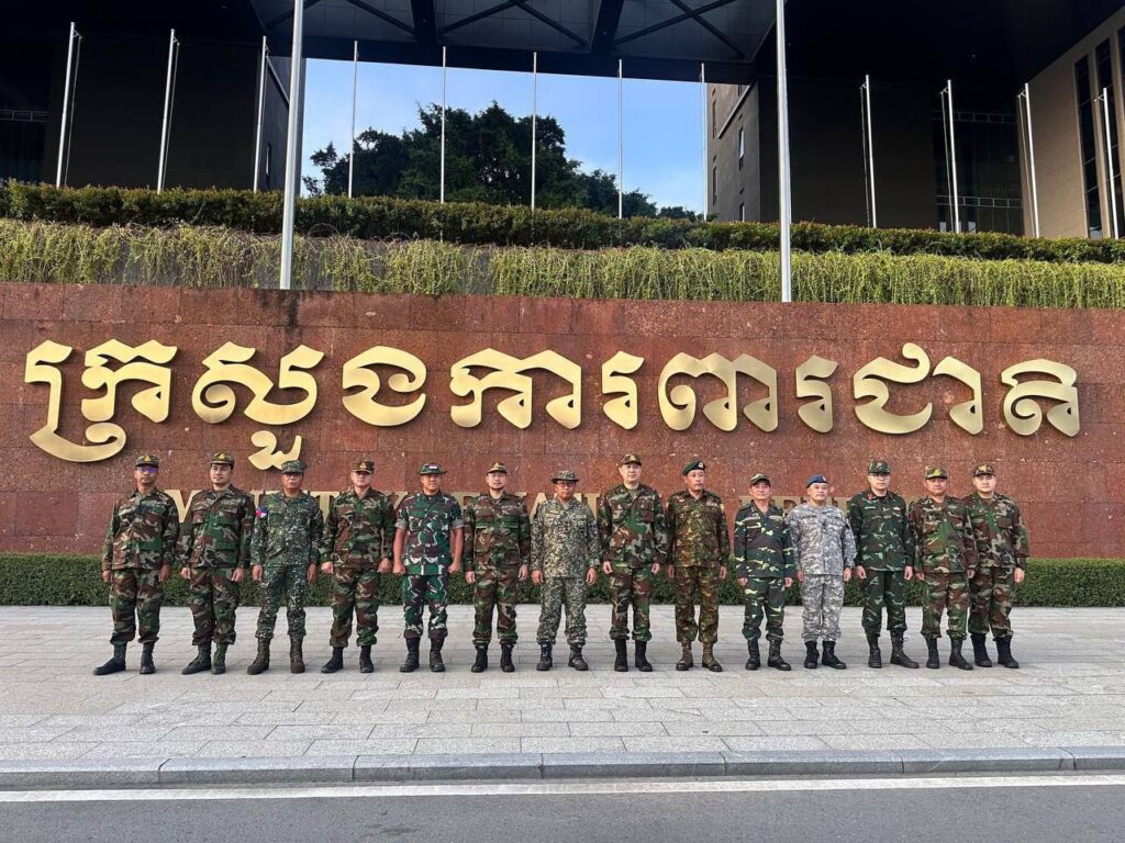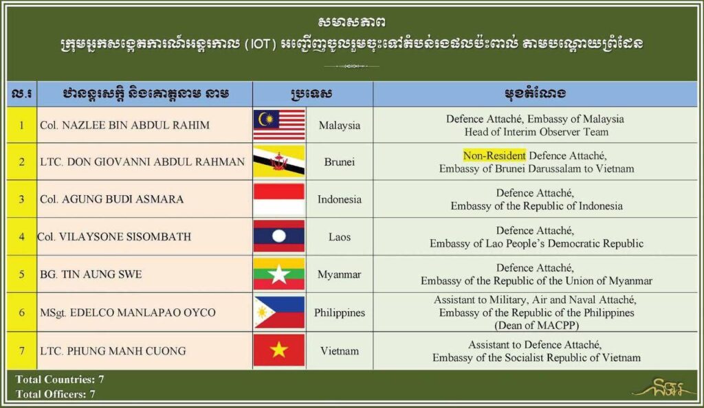 ភ្នំពេញ៖ ថ្ងៃព្រហស្បតិ៍ ១៤ ខែសីហា ឆ្នាំ២០២៥ ក្រសួងការពារជាតិ នៃព្រះរាជាណាចក្រកម្ពុជា បានសម្របសម្រួលជូន ក្រុមអ្នកសង្កេតការណ៍អន្តរកាល (IOT) ដឹកនាំដោយ លោកវរសេនីយ៍ឯក NAZLEE BIN ABDUL RAHIM អនុព័ន្ធយោធាម៉ាឡេស៊ី ប្រចាំកម្ពុជា ដែលមានតំណាងមកពីប្រទេសចំនួន ៦ ចូលរួម (ប្រ៊ុយណេ ឥណ្ឌូនេស៊ី ឡាវ មីយ៉ាន់ម៉ា ហ្វីលីពីន និងវៀតណាម) ដែលមាននិវេសន្នដ្ឋានក្នុង និងក្រៅប្រទេសកម្ពុជា ដោយមានសមាជិកសរុបចំនួន ៧ប្រទេស បានចេញដំណើរទៅកាន់ទីតាំងជាក់ស្តែងផ្សេងៗ ដើម្បីសង្កេតមើលស្ថានភាពសន្តិសុខតាមព្រំដែន ដែលប៉ះពាល់ផ្ទាល់ក្នុងអំឡុងជម្លោះព្រំដែនកម្ពុជា-ថៃ ដូចខាងក្រោម៖
