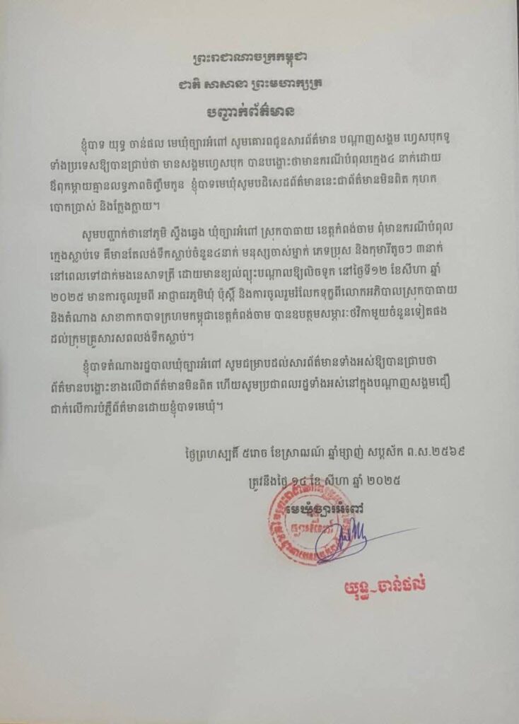 ភ្នំពេញ : នៅថ្ងៃទី ១៤ ខែ សីហា ឆ្នាំ២០២៥ លោកយុទ្ធ ចាន់ផល់ មេឃុំច្បារអំពៅ បានចេញសេចក្តីបញ្ជាក់ព័ត៌មានសូមគោរពជូនសារព័ត៌មាន បណ្ដាញសង្គម ហ្វេសបុកទូ ទាំងប្រទេសឱ្យបានជ្រាប់ថា មានសង្គមហ្វេសបុក បានបង្ហោះថាមានករណីបំពុលក្មេង៤ នាក់ដោយ ឪពុកម្តាយគ្មានលទ្ធភាពចិញ្ចឹមកូន នៅឃុំច្បារអំពៅ ស្រុកបាធាយ ខេត្តកំពង់ចាម ខ្ញុំបាទមេឃុំសូមបដិសេដព័ត៌មាននេះជាព័ត៌មានមិនពិត កុហក បោកប្រាស់ និងក្លែងក្លាយ។