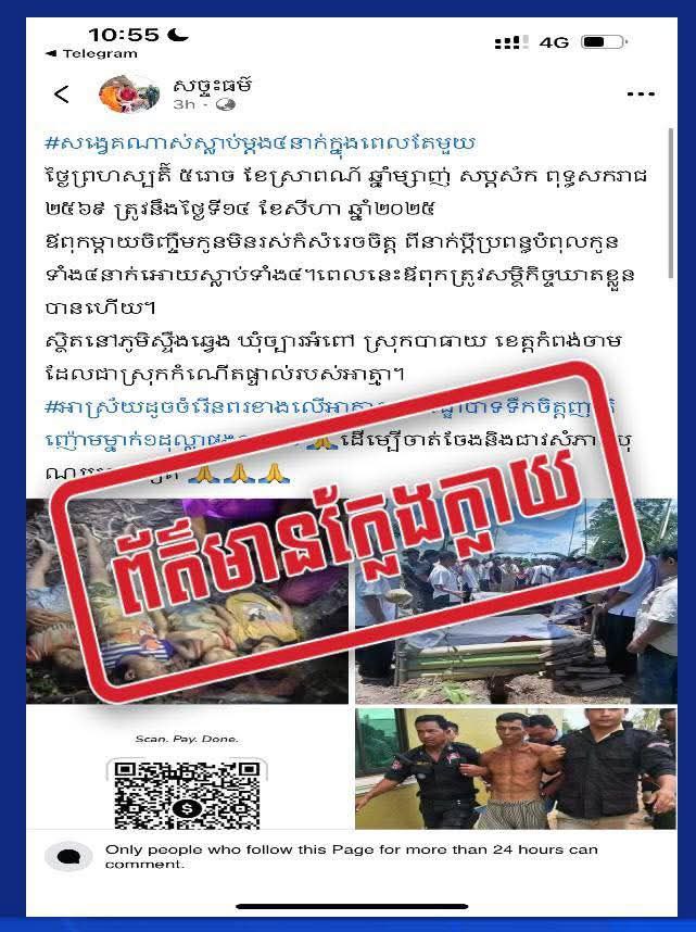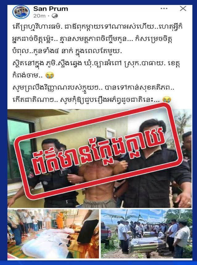 សូមបញ្ជាក់ថានៅភូមិ ស្ទឹងឆ្វេង ឃុំច្បារអំពៅ ស្រុកបាធាយ ខេត្តកំពង់ចាម ពុំមានករណ៏បំពុល ក្មេងស្លាប់ទេ គឺមានតែលង់ទឹកស្លាប់ចំនួន៤នាក់ មនុស្សចាស់ម្នាក់ ភេទប្រុស និងកុមារីតូចៗ ៣នាក់ នៅពេលទៅដាក់មងនេសាទត្រី ដោយមានខ្យល់ព្យុះបណ្តាលឱ្យលិចទូក នៅថ្ងៃទី១២ ខែសីហា ឆ្នាំ ២០២៥ មានការចូលរួមពី អាជ្ញាធរភូមិឃុំ ប៉ុស្តិ៍ និងការចូលរួមរំលែកទុក្ខពីលោកអភិបាលស្រុកបាធាយ និងតំណាង សាខាកាកបាទក្រហមកម្ពុជាខេត្តកំពង់ចាម បានឧបត្ថមសម្ភារៈថវិកាមួយចំនួនទៀតផង ដល់ក្រុមគ្រួសារសពលង់ទឹកស្លាប់។