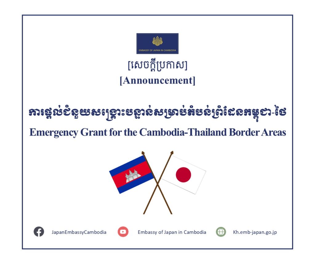 សារពីឯកឧត្តម អ៊ូអិណុ អាត់ស៊ូស៊ី បានបញ្ជាក់ថា ថ្ងៃទី ១៥ ខែសីហា រដ្ឋាភិបាលជប៉ុនបានសម្រេចផ្តល់ជំនួយសង្គ្រោះបន្ទាន់(ឥតសំណង)ដែលមានទឹកប្រាក់សរុបប្រមាណ ១,៨ លានដុល្លារអាមេរិក ដើម្បីឆ្លើយតបទៅនឹងតម្រូវការមនុស្សធម៌ជាបន្ទាន់នៅតាមតំបន់ព្រំដែនកម្ពុជា-ថៃ។