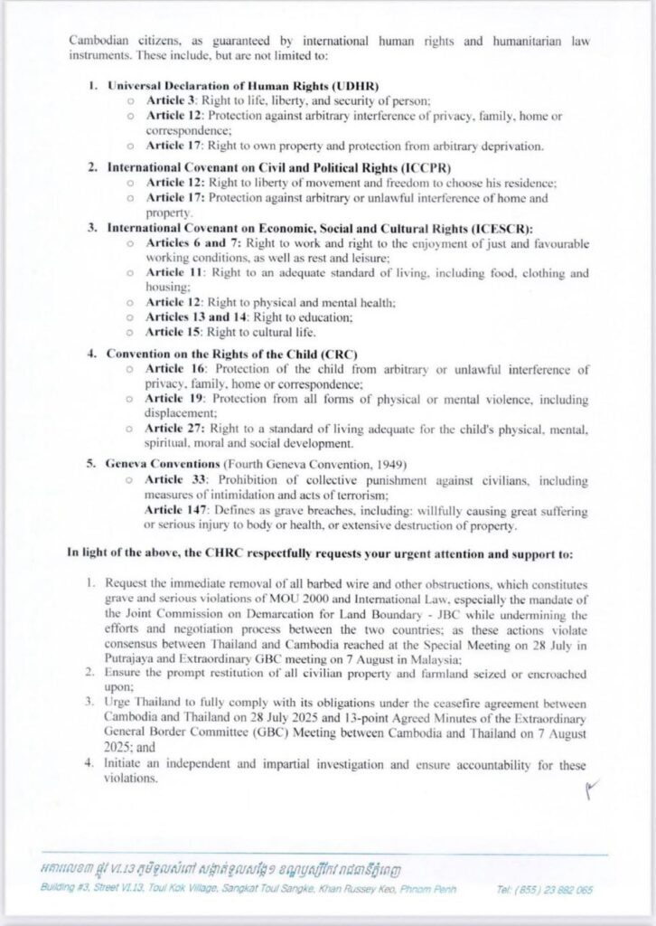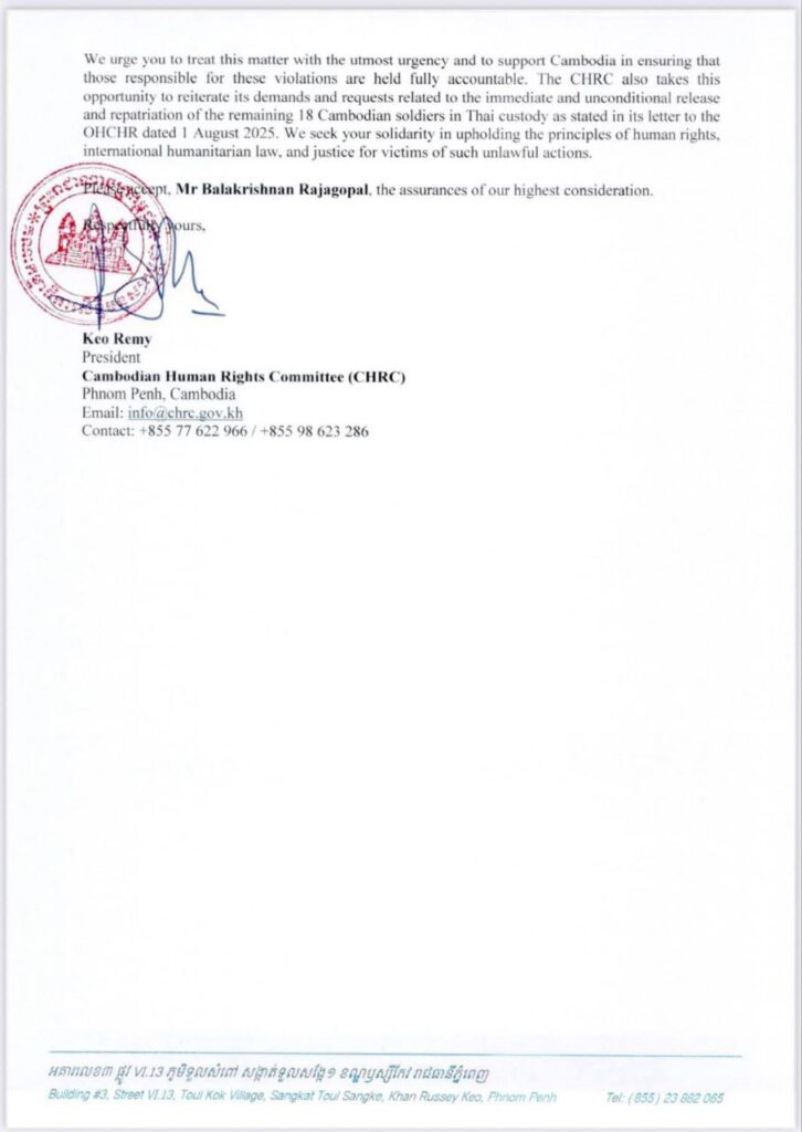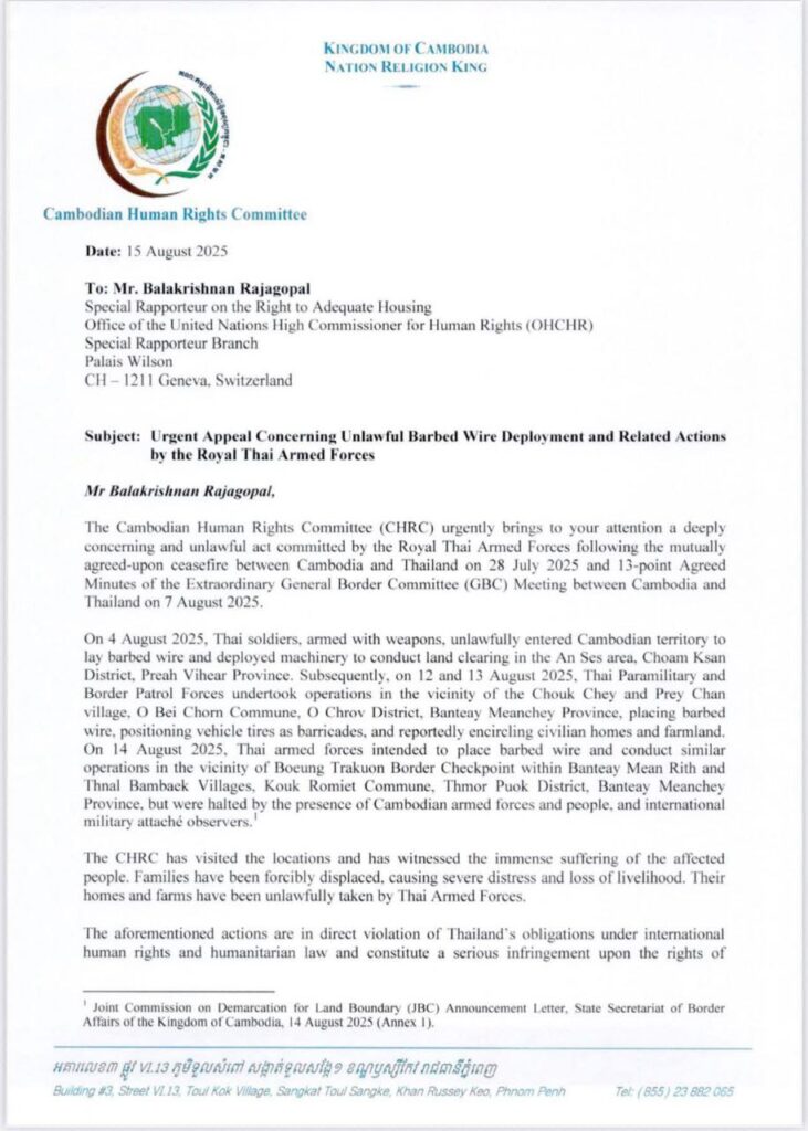 ភ្នំពេញ ៖ នៅថ្ងៃទី១៥ ខែសីហា ឆ្នាំ២០២៥នេះ ប្រធានគណៈកម្មាធិការសិទ្ធិមនុស្សកម្ពុជា ឯកឧត្តម កែវ រ៉េមី បានផ្ញើញត្តិបន្ទាន់មួយទៅកាន់ អ្នករាយការណ៍ពិសេសទទួលបន្ទុកសិទ្ធិលំនៅដ្ឋាន ប្រចាំនៅទីក្រុងហ្សឺណែវ ប្រទេសស្វីស ដោយបង្ហាញពីគោលបំណងសំខាន់ចំនួន៤ រួមមាន៖