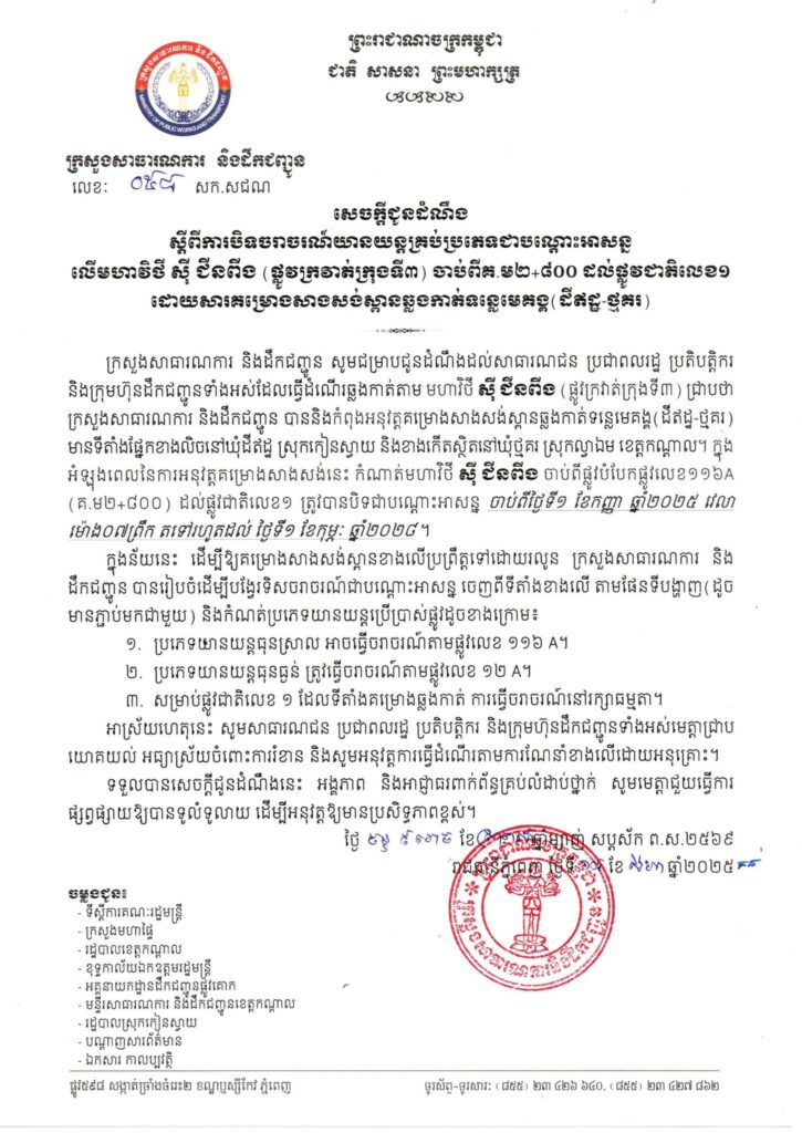 ភ្នំពេញ ៖ ក្រសួងសាធារណការ និងដឹកជញ្ជូន សូមជម្រាបជូនដំណឹងដល់សាធារណជន ប្រជាពលរដ្ឋ ប្រតិបត្តិករ និងក្រុមហ៊ុនដឹកជញ្ជូនទាំងអស់ដែលធ្វើដំណើរឆ្លងកាត់តាម មហាវិថី ស៊ី ជីនពីង (ផ្លូវក្រវាត់ក្រុងទី៣) ជ្រាបថា ក្រសួងសាធារណការ និងដឹកជញ្ជូន បាននិងកំពុងអនុវត្តគម្រោងសាងសង់ស្ពានឆ្លងកាត់ទន្លេមេគង្គ(ដីឥដ្ឋ-ថ្មគរ) មានទីតាំងផ្នែកខាងលិចនៅឃុំដីឥដ្ឋ ស្រុកកៀនស្វាយ និងខាងកើតស្ថិតនៅឃុំថ្មគរ ស្រុកល្វាឯម ខេត្តកណ្តាល។