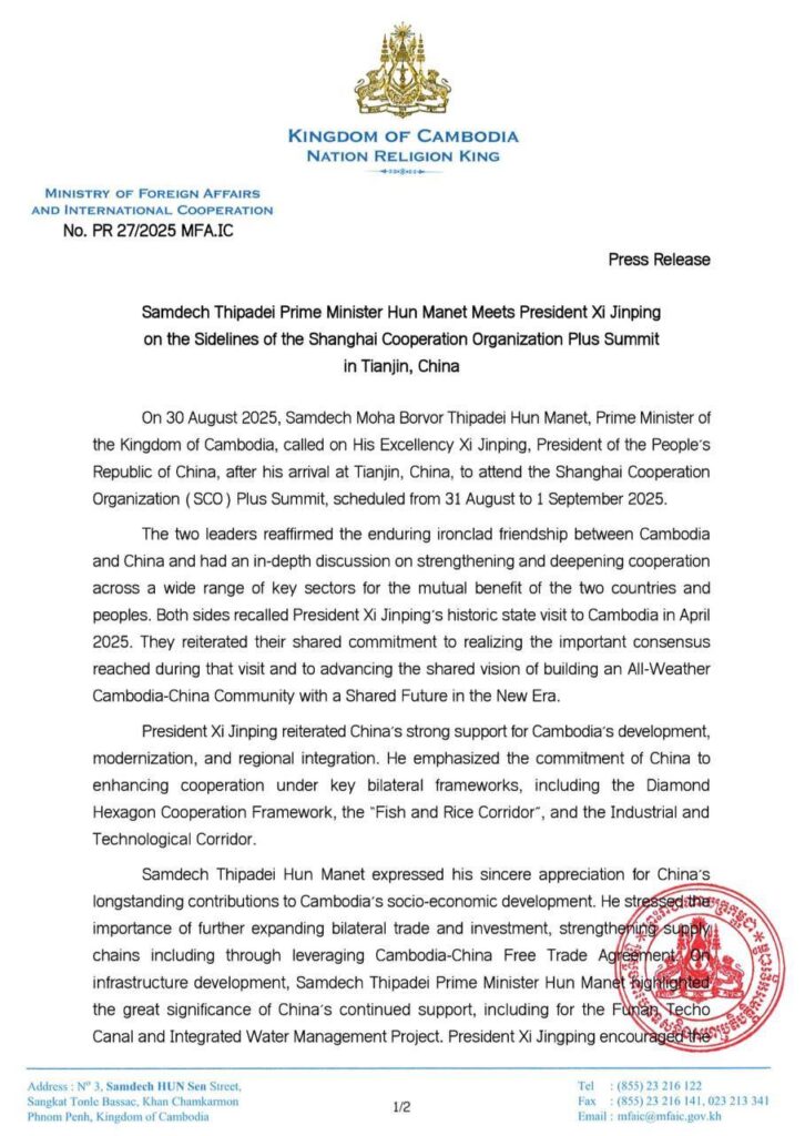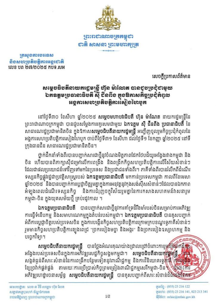 នៅថ្ងៃទី៣០ ខែសីហា ឆ្នាំ២០២៥ សម្តេចមហាបវរធិបតី ហ៊ុន ម៉ាណែត នាយករដ្ឋមន្ត្រីនៃ ព្រះរាជាណាចក្រកម្ពុជា បានជួបសម្តែងការរគួរសមជាមួយ ឯកឧត្តម ស៊ី ជីនពីង ប្រធានាធិបតី នៃ សាធារណរដ្ឋប្រជាមានិតចិន ក្នុងឱកាសសម្ដេចធិបតីនាយករដ្ឋមន្ត្រី អញ្ជើញចូលរួមកិច្ចប្រជុំកំពូលន អង្គការសហប្រតិបត្តិការសៀងហៃបូក ចាប់ពីថ្ងៃទី៣១ ខែសីហា ដល់ថ្ងៃទី១ ខែកញ្ញា ឆ្នាំ២០២៥ នៅទី ក្រុងធានជីន សាធារណរដ្ឋប្រជាមានិតចិន។