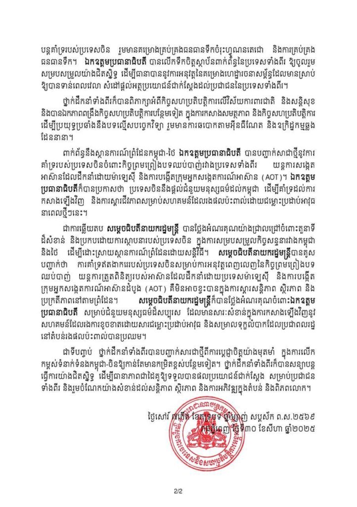 ជាការឆ្លើយតប សម្តេចធិបតីនាយករដ្ឋមន្ត្រី បានថ្លែងអំណរគុណយ៉ាងជ្រាលជ្រៅចំពោះតួនាទី ដ៏សំខាន់ និងប្រកបដោយការស្ថាបនារបស់ប្រទេសចិន ក្នុងការសម្របសម្រួលកិច្ចសន្ទនារវាងកម្ពុជា និងថៃ ដើម្បីដោះស្រាយស្ថានការណ៍ព្រំដែនដោយសន្តិវិធី សម្តេចធិបតីនាយករដ្ឋមន្ត្រីបានគូស បញ្ជាក់ថា ការគាំទ្រឥតងាកររបស់ប្រទេសចិនសម្រាប់ការអនុវត្តពេញលេញនៃកិច្ចព្រមព្រៀងបទ ឈប់បាញ់ យន្តការត្រួតពិនិត្យរបស់អាស៊ានដែលដឹកនាំដោយប្រទេសម៉ាឡេស៊ី និងការបង្កើត ក្រុមអ្នកសង្កេតការណ៍អាស៊ានដំបូង (AOT) គឺមិនអាចខ្វះបានក្នុងការស្ដារសន្តិភាព ស្ថិរភាព និង ប្រក្រតីភាពនៅតាមព្រំដែន។ សម្តេចធិបតីនាយករដ្ឋមន្ត្រីក៏បានថ្លែងអំណរគុណចំពោះឯកឧត្តម ប្រធានាធិបតី សម្រាប់ជំនួយមនុស្សធម៌ដ៏សប្បុរស ដែលមានសារៈសំខាន់ក្នុងការកសាងឡើងវិញនូវ សហគមន៍ដែលរងការខូចខាតដោយសារជម្លោះប្រដាប់អាវុធ និងសម្រាលទុក្ខលំបាកដែលប្រជាពលរដ្ឋ នៅតំបន់រងផលប៉ះពាល់បានប្រឈម។