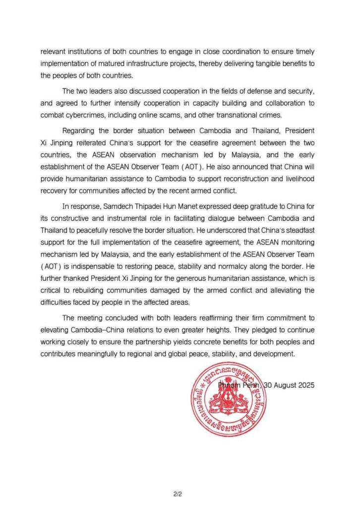 ថ្នាក់ដឹកនាំទាំងពីរបានបញ្ជាក់សារជាថ្មីនូវចំណងមិត្តភាពដែកថែបដ៏យូរអង្វែងរវាងកម្ពុជា និង ចិន ហើយបានពិភាក្សាស៊ីជម្រៅលើការពង្រឹង និងពង្រីកកិច្ចសហប្រតិបត្តិការលើវិស័យសំខាន់ៗ ដែលជាផលប្រយោជន៍ទៅវិញទៅមកនៃប្រទេស និងប្រជាជនទាំងពីរ។ ភាគីទាំងពីរបានរំលឹកពីដំណើរ ទស្សនកិច្ចផ្លូវរដ្ឋជាប្រវត្តិសាស្ត្ររបស់ ឯកឧត្តមប្រធានាធិបតី មកកាន់ប្រទេសកម្ពុជា កាលពីខែមេសា ឆ្នាំ២០២៥ និងបានបញ្ជាក់ការប្តេជ្ញាចិត្តរួមគ្នាក្នុងការអនុវត្តនូវកុងសង់ស៊ីសសំខាន់ៗដែលបានឯកភាព អំឡុងពេលដំណើរទស្សនកិច្ច និងការជំរុញចក្ខុវិស័យរួមគ្នានៃការកសាងសហគមន៍វាសនារួម កម្ពុជា-ចិន ក្នុងយុគសម័យថ្មី គ្រប់រដូវកាល ។