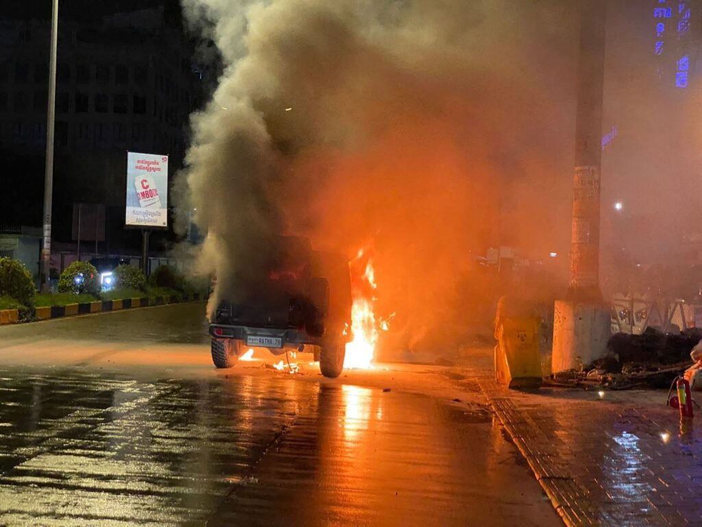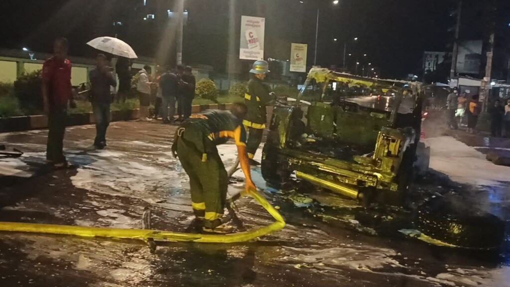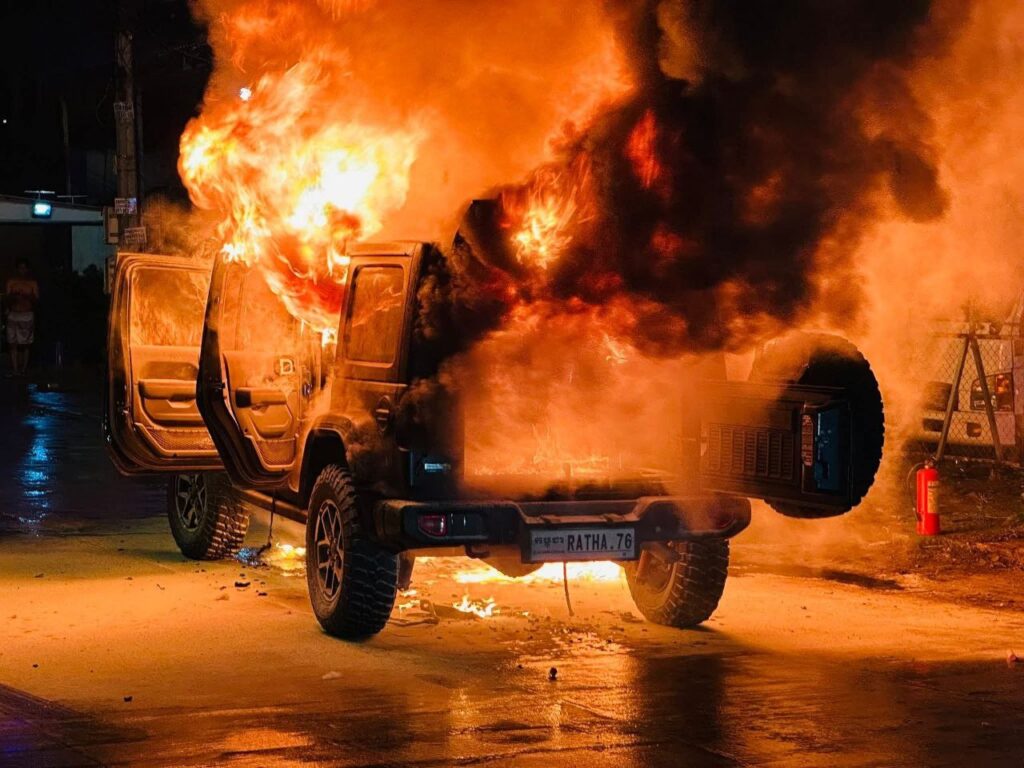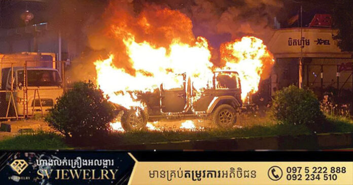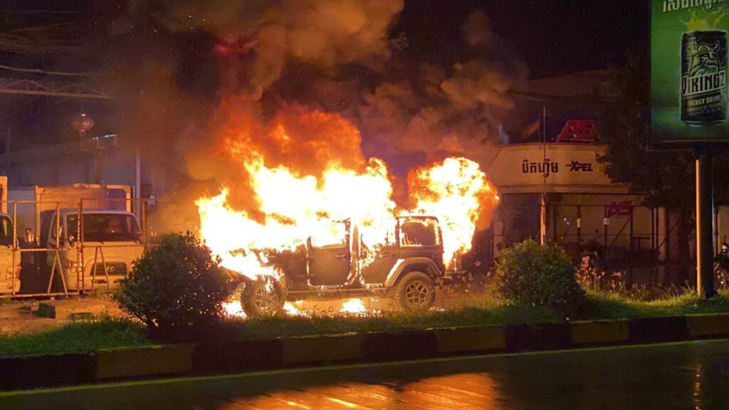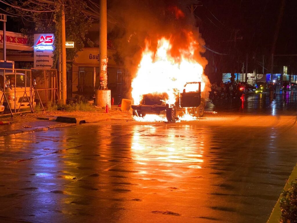 រថយន្ដស៊េរីទំនើប Jeep ពាក់ផ្លាកលេខ កម្ពុជា RATHA.76 ត្រូវបានអគ្គិភ័យឆាបឆេះអស់ទាំងស្រុក បន្ទាប់ពីបេីកបុកជាមួយរថយន្ដ TOYOTA Prius ពាក់ផ្លាកលេខ ភ្នំពេញ 2VE-3962 រួចបន្តទៅបុកម៉ូតូ HONDA VARIO ពាក់ផ្លាកលេខ ភ្នំពេញ 1KM-7137 បណ្ដាលឲ្យរងការខូចខាត រួចរថយន្ដក៏មានការឆ្លងចរន្តអគ្គិសនីបង្កចេញជាអណ្ដាតភ្លើងឆាបឆេះយ៉ាងសន្ធោសន្ធៅ។ ហេតុការណ៍នេះបានបង្កឲ្យមានការភ្ញាក់ផ្អើលកាលពីវេលាម៉ោង២:៣០នាទី រំលងអធ្រាត្រឈានចូល ថ្ងៃទី២៥ ខែកញ្ញា ឆ្នាំ២០២៥ ស្ថិតតាមបណ្ដោយផ្លូវណតប្រ៊ីត សង្កាត់អូរបែកក្អម ខណ្ឌសែនសុខ រាជធានីភ្នំពេញ។