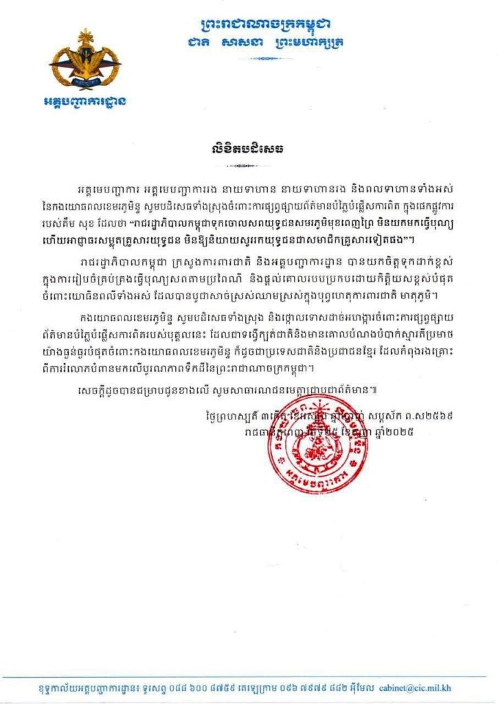 ភ្នំពេញ ៖ អគ្គមេបញ្ជាការ អគ្គមេបញ្ជាការរង នាយទាហាន នាយទាហានរង និងពលទាហានទាំងអស់ នៃកងយោធពលខេមរភូមិន្ទ សូមបដិសេធទាំងស្រុងចំពោះការផ្សព្វផ្សាយព័ត៌មានបំភ្លៃបំផ្លើសការពិត ក្នុងផេកផ្លូវកា របស់ឈ្មោះ គឹម សុខ ដែលថា «រាជរដ្ឋាភិបាលកម្ពុជាទុកចោលសពយុទ្ធជនសមរភូមិមុខពេញព្រៃ មិនយកមកធ្វើបុណ្យ ហើយអាជ្ញាធរសម្លុតគ្រួសារយុទ្ធជន មិនឱ្យនិយាយសួររកយុទ្ធជនជាសមាជិកគ្រួសារទៀតផង»។