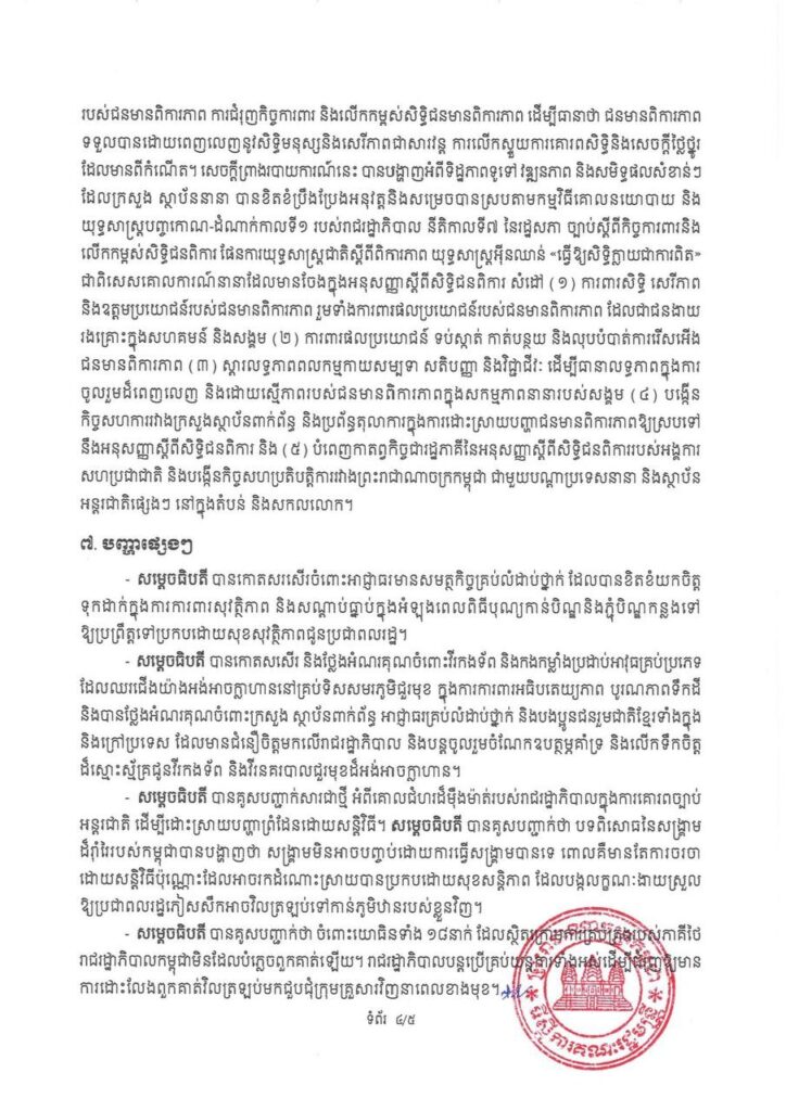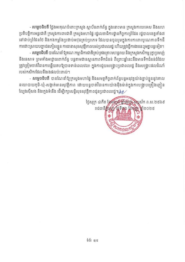 ភ្នំពេញ ៖ សេចក្តីប្រកាសព័ត៌មាន ស្តីពី លទ្ធផលកិច្ចប្រជុំពេញអង្គគណៈរដ្ឋមន្រ្តី នាព្រឹកថ្ងៃសុក្រ ៤កើត ខែអស្សុជ ឆ្នាំម្សាញ់ សប្តស័ក ព.ស.២៥៦៩ ត្រូវនឹងថ្ងៃទី២៦ ខែកញ្ញា ឆ្នាំ២០២៥ ក្រោមអធិបតីភាពដ៏ខ្ពង់ខ្ពស់របស់សម្តេចមហាបវរធិបតី ហ៊ុន ម៉ាណែត នាយករដ្ឋមន្ត្រី នៃព្រះរាជាណាចក្រកម្ពុជា៕ រក្សាសិទ្ធដោយ : សុទ្ធលី