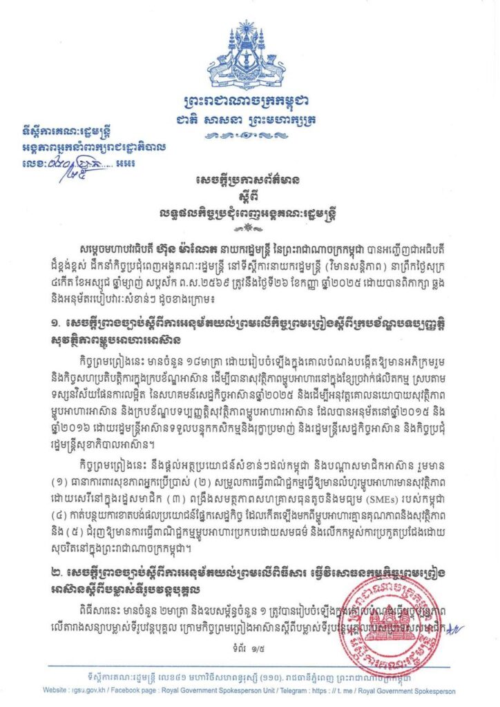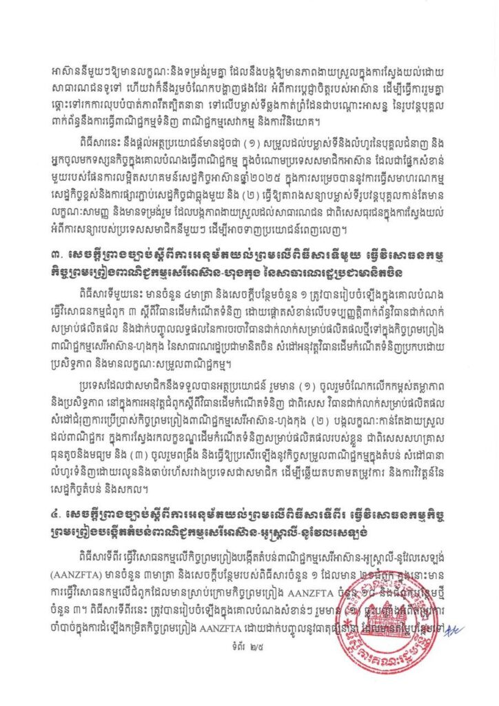 ភ្នំពេញ ៖ កិច្ចព្រមព្រៀងនេះ មានចំនួន ១៨មាត្រា ដោយរៀបចំឡើងក្នុងគោលបំណងបង្កើតឱ្យមានអភិក្រមរួម និងកិច្ចសហប្រតិបត្តិការក្នុងក្របខ័ណ្ឌអាស៊ាន ដើម្បីធានាសុវត្ថិភាពម្ហូបអាហារនៅក្នុងខ្សែច្រវាក់ផលិតកម្ម ស្របតាមទស្សនវិស័យផែនការលម្អិត នៃសហគមន៍សេដ្ឋកិច្ចអាស៊ានឆ្នាំ២០២៥ និងដើម្បីអនុវត្តគោលនយោបាយសុវត្ថិភាពម្ហូបអាហារអាស៊ាន និងក្របខ័ណ្ឌបទប្បញ្ញត្តិសុវត្ថិភាពម្ហូបអាហារអាស៊ាន ដែលបានអនុម័តនៅឆ្នាំ២០១៥ និងឆ្នាំ២០១៦ ដោយរដ្ឋមន្ត្រីអាស៊ានទទួលបន្ទុកកសិកម្មនិងរុក្ខាប្រមាញ់ និងរដ្ឋមន្ត្រីសេដ្ឋកិច្ចអាស៊ាន និងកិច្ចប្រជុំ រដ្ឋមន្ត្រីសុខាភិបាលអាស៊ាន។