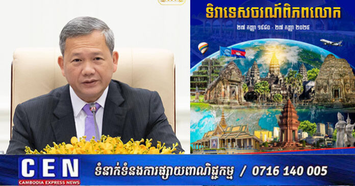ភ្នំពេញ ៖ សម្តេចបវរធិបតី ហ៊ុន ម៉ាណែត នាយករដ្ឋមន្រ្តីនៃព្រះរាជាណាចក្រកម្ពុជា បានមានប្រសាសន៍ថា ការប្រារព្ធទិវាដ៏មានអត្ថន័យនេះ បានសបញ្ជាក់អំពីការយកចិត្តទុកដាក់ និងការទទួលខុសត្រូវខ្ពស់របស់អង្គការទេសចរណ៍សហប្រជាជាតិ (UN Tourism) ក៏ដូចជាបណ្តាប្រទេស លើសកលលោក រដ្ឋជាសមាជិក អង្គការជាតិ អន្តរជាតិ និងដៃគូអភិវឌ្ឍនានា ដោយបាននិងកំពុងផ្តោតលើ ការអភិវឌ្ឍវិស័យទេសចរណ៍ដោយឈរលើគោលការណ៍ចីរភាព ភាពធន់ និងបរិយាបន្ន។ ក្នុងន័យនេះ រដ្ឋជាសមាជិកទាមទារឱ្យមានអភិបាលកិច្ចល្អ ការដាក់ចេញផែនការយុទ្ធសាស្ត្រ និងការកំណត់អាទិភាព សកម្មភាពការងារច្បាស់លាស់ ជាមួយនឹងការតាមដានវាយតម្លៃការអនុវត្តជាប់ជាប្រចាំ ឱ្យស្របតាមគោលដៅ ចីរភាពរយៈពេលវែង។