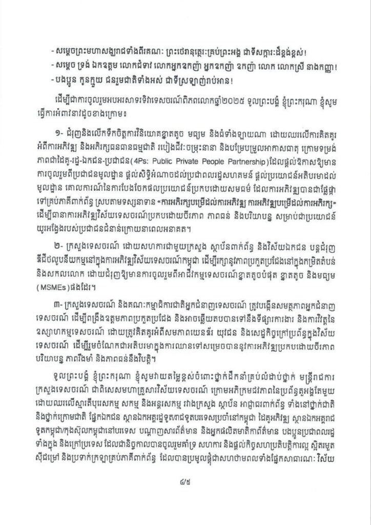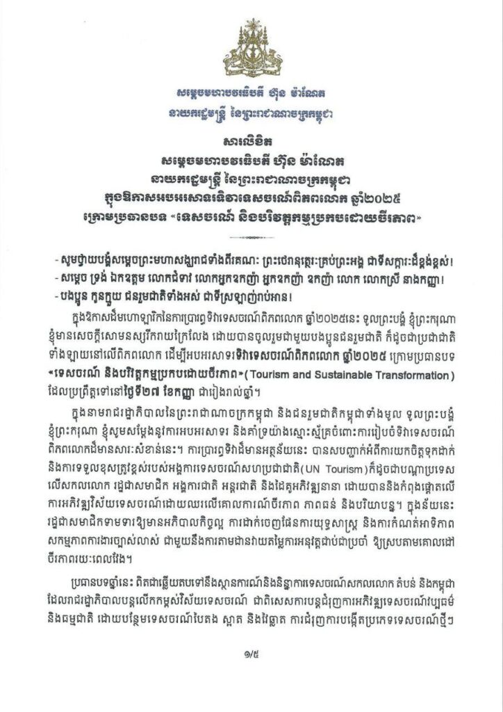 សម្តេចបវរធិបតី ហ៊ុន ម៉ាណែត បានថ្លែងថា ដើម្បីជាការចូលរួមអបអរសាទរទិវាទេសចរណ៍ពិភពលោកឆ្នាំ២០២៥ ទូលព្រះបង្គំ ខ្ញុំព្រះករុណា ខ្ញុំសូមធ្វើការអំពាវនាវដូចខាងក្រោម៖
