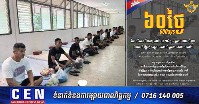 ភ្នំពេញ ៖ ក្រសួងការពារជាតិ បានឲ្យដឹងថា ថ្ងៃនេះជា ថ្ងៃទី៦០ហើយ ដែលវីរកងទ័ពកម្ពុជាចំនួន ១៨រូប ត្រូវបានចាប់ខ្លួន និងដាក់ឱ្យស្ថិតក្រោមការឃុំគ្រងរបស់យោធាថៃ។