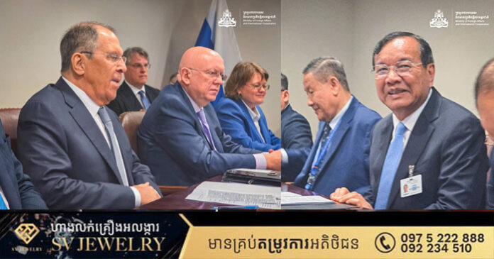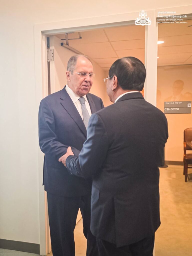 នៅព្រឹកថ្ងៃទី២៦ខែកញ្ញាឆ្នាំ២០២៥ ឯកឧត្តមឧបនាយករដ្ឋមន្ត្រី ប្រាក់ សុខុន រដ្ឋមន្ត្រីការបរទេស និងសហប្រតិបត្តិការអន្តរជាតិ បានអញ្ជើញជួបពិភាក្សាទ្វេភាគីជាមួយ ឯកឧត្តម Sergey Lavrov រដ្ឋមន្ត្រីការបរទេសនៃសហព័ន្ធរុស្ស៊ី អំឡុងកិច្ចពិភ្សាទូទៅនៃមហាសន្និបាតអង្គការសហប្រជាជាតិ លើកទី៨០ ក្នុងទីក្រុងញូវយ៉ក សហរដ្ឋអាម៉េរិក។