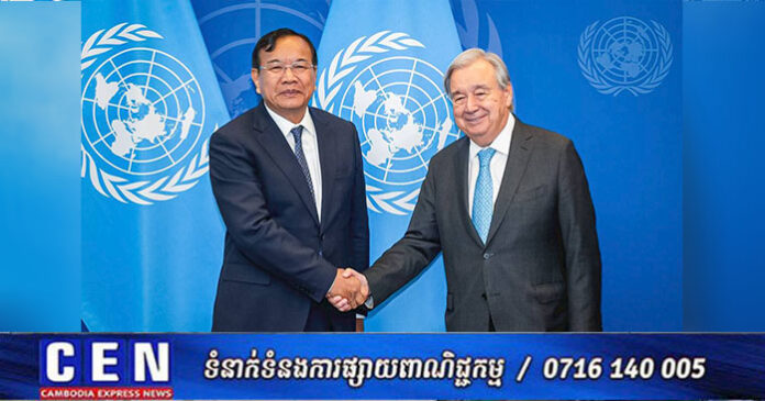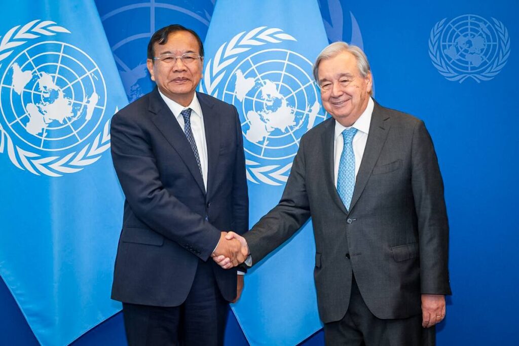 សហរដ្ឋអាម៉េរិក ៖ នៅរសៀលថ្ងៃទី២៦ ខែកញ្ញា ឆ្នាំ២០២៥ ឯកឧត្តមឧបនាយករដ្ឋមន្ត្រី ប្រាក់ សុខុន រដ្ឋមន្ត្រីការបរទេស និងសហប្រតិបត្តិការអន្តរជាតិ បានអញ្ជើញជួបពិភាក្សាទ្វេភាគីជាមួយ ឯកឧត្តម António Guterres អគ្គលេខាធិការអង្គការសហប្រជាជាតិ អំឡុងកិច្ចពិភាក្សាទូទៅនៃមហាសន្និបាតអង្គការសហប្រជាជាតិ លើកទី៨០ក្នុងទីក្រុងញូវយ៉ក សហរដ្ឋអាម៉េរិក។