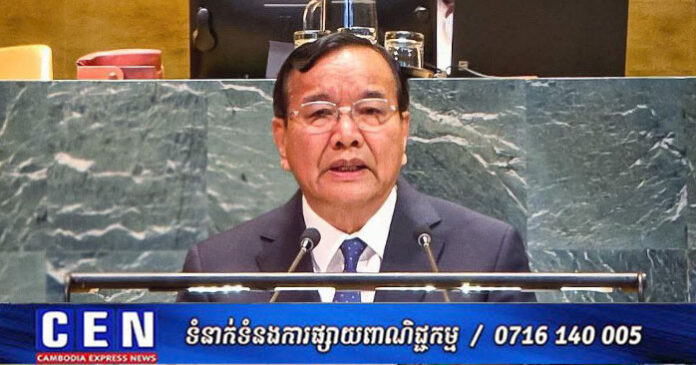 ឯកឧត្តម ប្រាក់ សុខុន បានថ្លែងបន្តទៀតថា “ការវិវត្តប្រែប្រួលរបស់ប្រទេសកម្ពុជា គឺជាសក្ខីភាពនៃអត្ថន័យមូលបទរបស់មហាសន្និបាតអង្គការ សហប្រជាជាតិលើកទី៨០ ពោលគឺជាប្រទេសដែលធ្លាប់ត្រូវការសន្តិភាព បានក្លាយជាប្រទេសដែលជួយផ្តល់ សន្តិភាព និងស្ថិរភាពសម្រាប់ប្រទេសដទៃទៀត។ ហេតុនេះ ខ្ញុំពិតជាមានសេចក្ដីឈឺចាប់ជាពន់ពេកក្នុងការ ជម្រាបជូនមហាសន្និបាតថ្ងៃនេះថា សន្តិភាពនៅក្នុងប្រទេសរបស់យើងខ្ញុំផ្ទាល់ ដែលទទួលបានដោយ លំបាក ហើយដែលយើងស្រលាញ់យ៉ាងជ្រាលជ្រៅ និងចែករំលែកអស់ពីដួងចិត្តនៅជុំវិញពិភពលោក