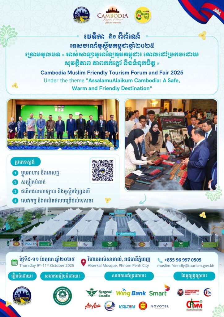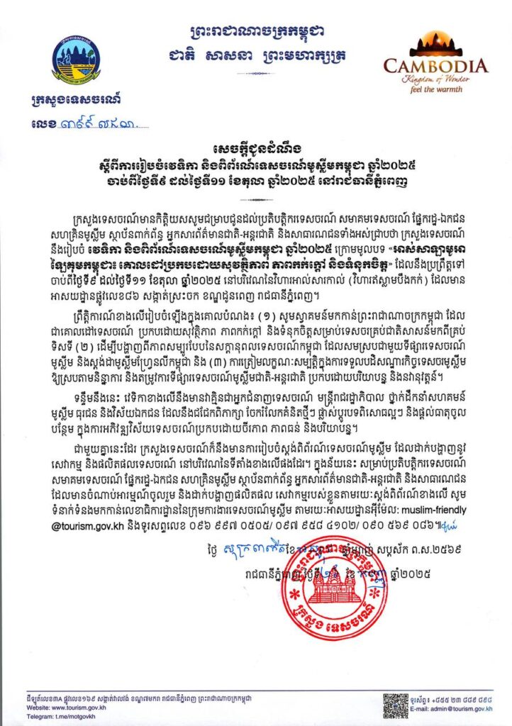 ភ្នំពេញ ៖ ក្រសួងទេសចរណ៍សូមជម្រាបជូនដល់ប្រតិបត្តិករទេសចរណ៍ សមាគមទេសចរណ៍ ផ្នែករដ្ឋ-ឯកជន សហគ្រិនមូស្លីម ស្ថាប័នពាក់ព័ន្ធ អ្នកសារព័ត៌មានជាតិ-អន្តរជាតិ និងសាធារណជនទាំងអស់ជ្រាបថា ក្រសួងទេសចរណ៍ នឹងរៀបចំ វទិកា និងពិព័រណ៍ទេសចរណ៍មូស្លីមកម្ពុជា ឆ្នាំ២០២៥ ក្រោមមូលបទ “អាស់សាឡាមូអា ឡៃគុមកម្ពុជា៖ គោលដៅប្រកបដោយសុវត្ថិភាព ភាពកក់ក្តៅ និងទំនុកចិត្ត» ដែលនឹងប្រព្រឹត្តទៅ ចាប់ពីថ្ងៃទី៩ ដល់ថ្ងៃទី១១ ខែតុលា ឆ្នាំ២០២៥ នៅបរិវេណនៃវិហារអាល់សារកាល់ (វិហារឥស្លាមបឹងកក់) ដែលមាន អាសយដ្ឋានផ្លូវលេខ៨៦ សង្កាត់ស្រះចក ខណ្ឌដូនពេញ រាជធានីភ្នំពេញ។