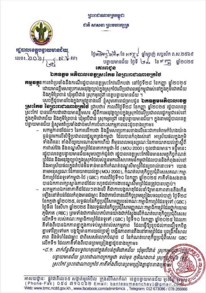 អភិបាលខេត្តុបន្ទាយមានជ័យ បានជម្រាបជូន ឯកឧត្តមអភិបាលខេត្ត ស្រះកែវ នៃព្រះរាជាណាចក្រថៃ ជ្រាបថា៖ កាលពីថ្ងៃទី២៨ ខែកញ្ញា ឆ្នាំ២០២៥ រដ្ឋបាលខេត្ត ស្រះកែវ បានលើកបដាដោយមានខ្លឹមសារ ស្តីពីការអនុវត្តច្បាប់ក្នុងស្រុកថៃលើប្រជាពលរដ្ឋកម្ពុជារស់នៅ ក្នុងភូមិជោគជ័យ និងភូមិព្រៃចាន់ ឃុំអូរបីជាន់ ស្រុកអូរជ្រៅ ខេត្តបន្ទាយមានជ័យ។ ក្នុងនាមរដ្ឋបាលខេត្ត បន្ទាយមានជ័យ ខ្ញុំសូមតវ៉ាប្រឆាំងដាច់អហំការចំពោះសកម្មភាពនេះដូចខាងក្រោម៖