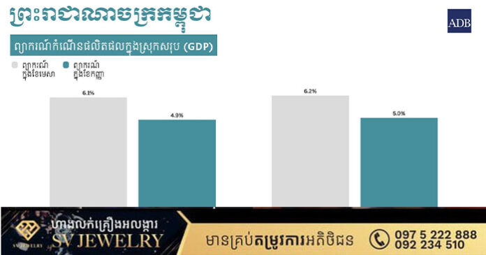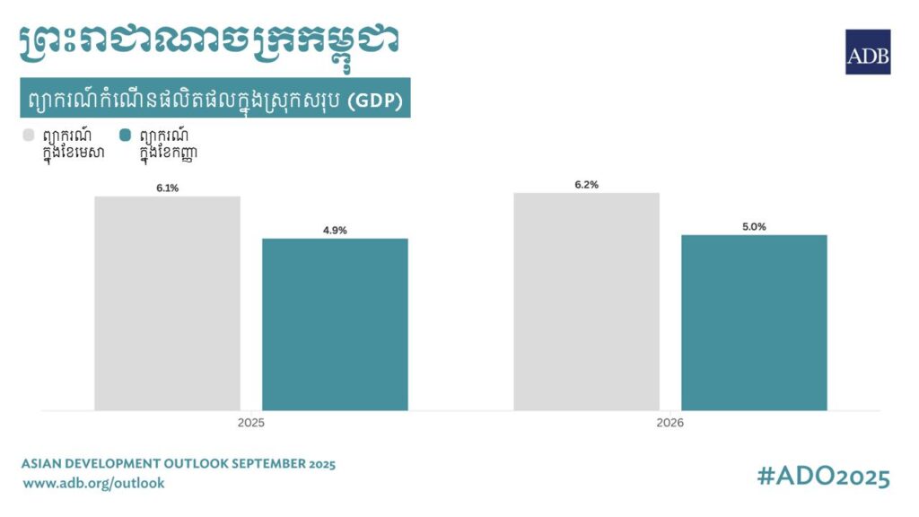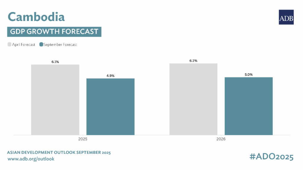ភ្នំពេញ ៖ ថ្ងៃទី៣០ ខែកញ្ញា ឆ្នាំ២០២៥ ធនាគារអភិវឌ្ឍន៍អាស៊ី (ADB)បានបន្ថយការព្យាករកំណើនសេដ្ឋកិច្ចសម្រាប់កម្ពុជាពី ៦,១% មក ៤,៩% សម្រាប់ឆ្នាំ ២០២៥ និងពី ៦,២% មក ៥,០% សម្រាប់ឆ្នាំ ២០២៦ ដោយឆ្លុះបញ្ចាំងពីបញ្ហាប្រឈមសេដ្ឋកិច្ចទាក់ទងនឹងភាពតានតឹងភូមិសាស្ត្រនយោបាយជាមួយប្រទេសថៃ និងភាពមិនច្បាស់លាស់ជុំវិញទីផ្សារនាំចេញទៅសហរដ្ឋអាមេរិក។ ទោះជាយ៉ាងណា របាយការណ៍របស់ ADB មានការរំពឹងទុកអំពីកំណើនរឹងមាំដល់ឆ្នាំ ២០២៦ ដែលជំរុញដោយការបន្តលូតលាស់នៃវិស័យឧស្សាហកម្ម និងលំហូរចូលជាបន្តបន្ទាប់នៃការវិនិយោគផ្ទាល់ពីបរទេស។