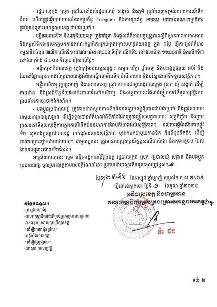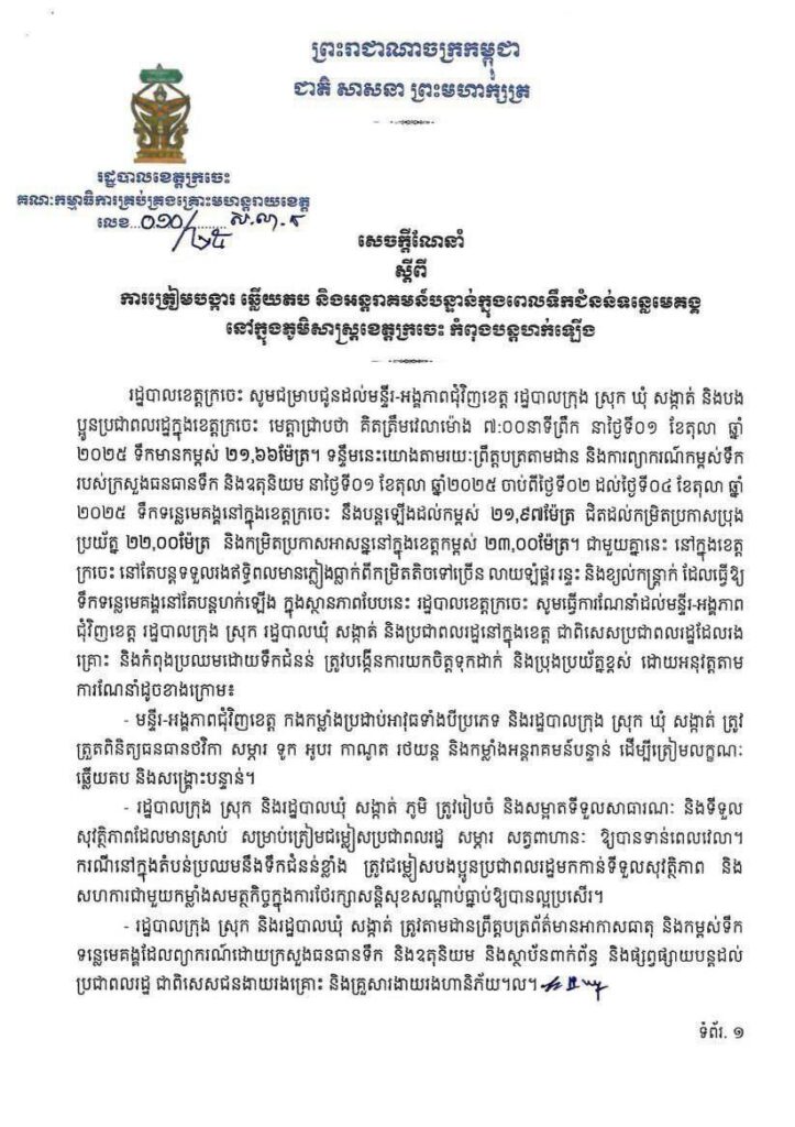 រដ្ឋបាលខេត្តក្រចេះ សូមជម្រាបជូនដល់មន្ទីរ-អង្គភាពជុំវិញខេត្ត រដ្ឋបាលក្រុង ស្រុក ឃុំ សង្កាត់ និងបង ប្អូនប្រជាពលរដ្ឋក្នុងខេត្តក្រចេះ មេត្តាជ្រាបថា គិតត្រឹមវេលាម៉ោង ៧:០០នាទីព្រឹក នាថ្ងៃទី០១ ខែតុលា ឆ្នាំ ២០២៥ ទឹកមានកម្ពស់ ២១,៦៦ម៉ែត្រ។ ទន្ទឹមនេះយោងតាមរយៈព្រឹត្តបត្រតាមដាន និងការព្យាករណ៍កម្ពស់ទឹក របស់ក្រសួងធនធានទឹក និងឧតុនិយម នាថ្ងៃទី០១ ខែតុលា ឆ្នាំ២០២៥ ចាប់ពីថ្ងៃទី០២ ដល់ថ្ងៃទី០៤ ខែតុលា ឆ្នាំ ២០២៥ ទឹកទន្លេមេគង្គនៅក្នុងខេត្តក្រចេះ នឹងបន្តឡើងដល់កម្ពស់ ២១,៩៧ម៉ែត្រ ជិតដល់កម្រិតប្រកាសប្រុង ប្រយ័ត្ន ២២,០០ម៉ែត្រ និងកម្រិតប្រកាសអាសន្ននៅក្នុងខេត្តកម្ពស់ ២៣,០០ម៉ែត្រ។ ជាមួយគ្នានេះ នៅក្នុងខេត្ត ក្រចេះ នៅតែបន្តទទួលរងឥទ្ធិពលមានភ្លៀងធ្លាក់ពីកម្រិតតិចទៅច្រើន លាយឡំផ្គរ រន្ទះ និងខ្យល់កន្ត្រាក់ ដែលធ្វើឱ្យ ទឹកទន្លេមេគង្គនៅតែបន្តហក់ឡើង ក្នុងស្ថានភាពបែបនេះ រដ្ឋបាលខេត្តក្រចេះ សូមធ្វើការណែនាំដល់មន្ទីរ-អង្គភាព ជុំវិញខេត្ត រដ្ឋបាលក្រុង ស្រុក រដ្ឋបាលឃុំ សង្កាត់ និងប្រជាពលរដ្ឋនៅក្នុងខេត្ត ជាពិសេសប្រជាពលរដ្ឋដែលរង គ្រោះ និងកំពុងប្រឈមដោយទឹកជំនន់ ត្រូវបង្កើនការយកចិត្តទុកដាក់ និងប្រុងប្រយ័ត្នខ្ពស់ ដោយអនុវត្តតាម ការណែនាំដូចខាងក្រោម៖