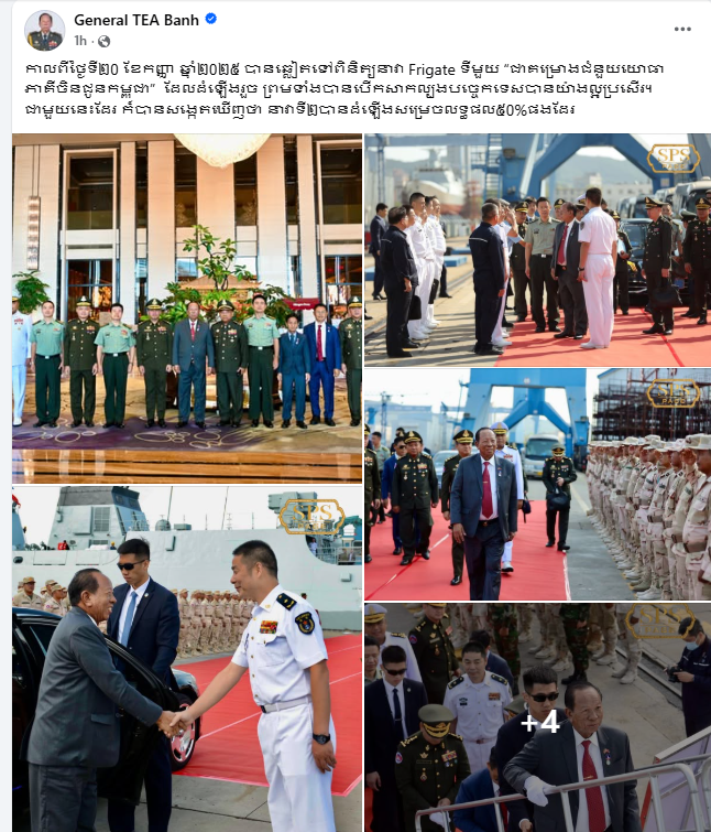 ភ្នំពេញ៖ សម្តេចពិជ័យសេនា ទៀ បាញ់ ឧត្តមប្រឹក្សាផ្ទាល់ព្រះមហាក្សត្រ បានអញ្ជើញទៅពិនិត្យនាវា Frigate ទីមួយ “ជាគម្រោងជំនួយយោធាភាគីចិនជូនកម្ពុជា” ដែលដំឡើងរួច ព្រមទាំងបានបើកសាកល្បងបច្ចេកទេសបានយ៉ាងល្អប្រសើរ កាលពីថ្ងៃទី២០ ខែកញ្ញា ឆ្នាំ២០២៥ កន្លងទៅនេះ។