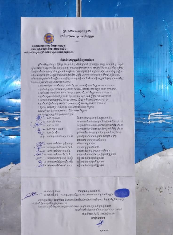 - ប្រហិតដង្កៀបក្តាម Fផលិតនៅប្រទេស ថៃ ចំនួន 224 កេស ស្មើ 2,440 គីឡូក្រាម EXP: 2027-07-27