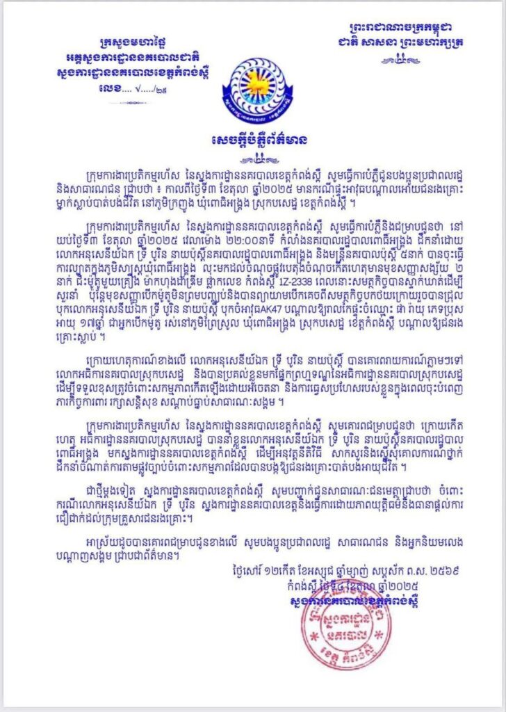 ក្រុមការងារប្រតិកម្មរហ័ស នៃស្នងការដ្ឋាននគរបាលខេត្តកំពង់ស្ពឺ សូមធ្វើការបំភ្លឺនិងជម្រាបជូនថា នៅយប់ថ្ងៃទី៣ ខែតុលា ឆ្នាំ២០២៥ វេលាម៉ោង ២២:០០នាទី កំលាំងនគរបាលរដ្ឋបាលពោធិ៍អង្ក្រង ដឹកនាំដោយ លោកអនុសេនីយ៍ឯក ទ្រី បូរិន នាយប៉ុស្តិ៍នគរបាលរដ្ឋបាលពោធិ៍អង្គ្រង និងមន្ត្រីនគរបាលប៉ុស្តិ៍ ៥នាក់ បានចុះធ្វើ ការល្បាតក្នុងភូមិសាស្ត្រឃុំពោធិ៍អង្គង់ លុះមកដល់ចំណុចផ្លូវបេតុងចំណុចកើតហេតុមានមុខសញ្ញាសង្ស័យ ២ នាក់ ជិះម៉ូតូមួយគ្រឿង ម៉ាកហុងដាំឌីម ផ្លាកលេខ កំពង់ស្ពឺ 1Z-2338 ពេលនោះសមត្ថកិច្ចបានស្ទាក់ឃាត់ដើម្បីសួរនាំ ប៉ុន្តែមុខសញ្ញាបើកម៉ូតូមិនព្រមបញ្ឈប់និងបានព្យាយាមបើកគេចពីសមត្ថកិច្ចបកថយក្រោយរួចបានជ្រុល បុកលោកអនុសេនីយ៍ឯក ទ្រី បូរិន នាយប៉ុស្តិ៍ បុកចំអាវុធAK47 បណ្តាលឱ្យរាលកៃផ្ទុះចំឈ្មោះ ផា រ៉ាយុ ភេទប្រុស អាយុ ១៧ឆ្នាំ ជាអ្នកបើកម៉ូតូ រស់នៅភូមិព្រៃស្រូល ឃុំពោធិអង្គ្រង ស្រុកបសេដ្ឋ ខេត្តកំពង់ស្ពឺ បណ្ដាលឱ្យជនរងគ្រោះស្លាប់ ។