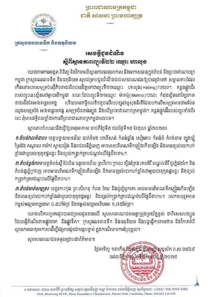 យោងតាមការអង្កេត ពិនិត្យ និងវិភាគលើស្ថានភាពធាតុអាកាស និងអាកាសធាតុក្នុងតំបន់ និងព្រះរាជាណាចក កម្ពុជា ក្រសួងធនធានទឹក និងឧតុនិយម សូមជម្រាបជូនដំណឹងដល់សាធារណជនឱ្យបានជ្រាបថា សម្ពាធទាបដែល កើតនៅមហាសមុទ្រប៉ាស៊ីភិចខាងលិចបានវិវត្តទៅជាព្យុះទី២២ឈ្មោះ ហាលុង(Halong)T252 – គន្លងផ្លូវដើរ របស់ព្យុះនេះស្ថិតនៅឆ្ងាយពីកម្ពុជា ខណៈដែលព្យុះទី២១ឈ្មោះ ម៉ាតម៉ូ(Matmo)T2521 កំពុងស្ថិតនៅក្បែរភាគ ខាងជើងនៃអាងទន្លេមេគង្គ ហើយមានឥទ្ធិពលតិចតួចលើរបបខ្យល់មូសុងនិរតីដែលបក់លើសមុទ្រអានដាមម៉ែន ឈូងសមុទ្រថៃ អាងទន្លេមេគង្គ សមុទ្រចិនខាងត្បូង និងលើព្រះរាជាណាចក្រកម្ពុជា។ គន្លងផ្លូវដើររបស់ព្យុះទាំងពីរ នេះ ពុំមានឥទ្ធិពលខ្លាំងមកលើព្រះរាជាណាចក្រកម្ពុជានោះទេ។