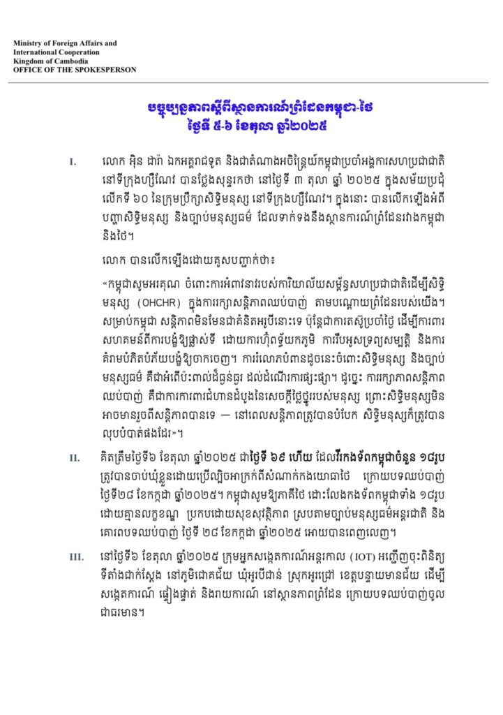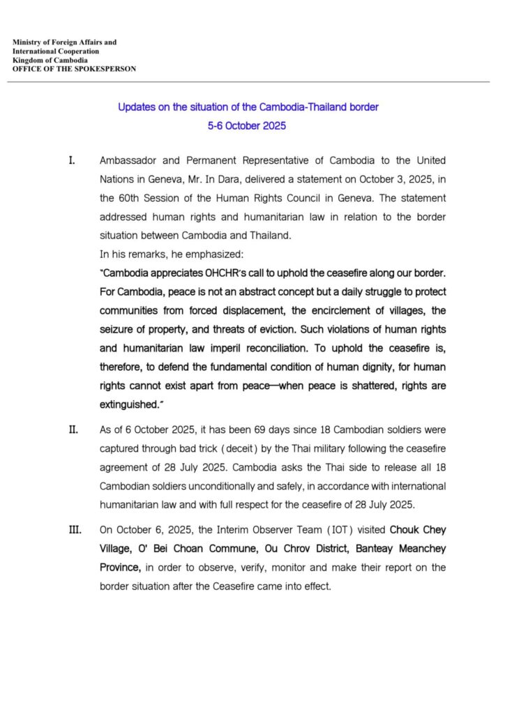 គិតត្រឹមថ្ងៃទី៦ ខែតុលា ឆ្នាំ២០២៥ ជាថ្ងៃទី ៦៩ ហើយ ដែលវីរកងទ័ពកម្ពុជាចំនួន ១៨រូប ត្រូវបានចាប់ឃុំខ្លួនដោយប្រើល្បិចអាក្រក់ពីសំណាក់កងយោធាថ ក្រោយបទឈប់បាញ់ ថ្ងៃទី២៨ ខែកក្កដា ឆ្នាំ២០២៥។ កម្ពុជាសូមឱ្យភាគីថៃ ដោះលែងកងទ័ពកម្ពុជាទាំង ១៨រូប ដោយគ្មានលក្ខខណ្ឌ ប្រកបដោយសុខសុវត្ថិភាព ស្របតាមច្បាប់មនុស្សធម៌អន្តរជាតិ និង គោរពបទឈប់បាញ់ ថ្ងៃទី ២៨ ខែកក្កដា ឆ្នាំ២០២៥ អោយបានពេញលេញ។