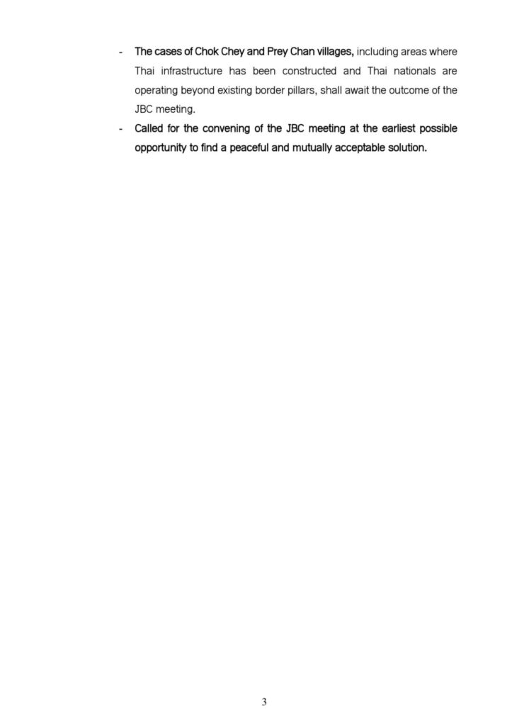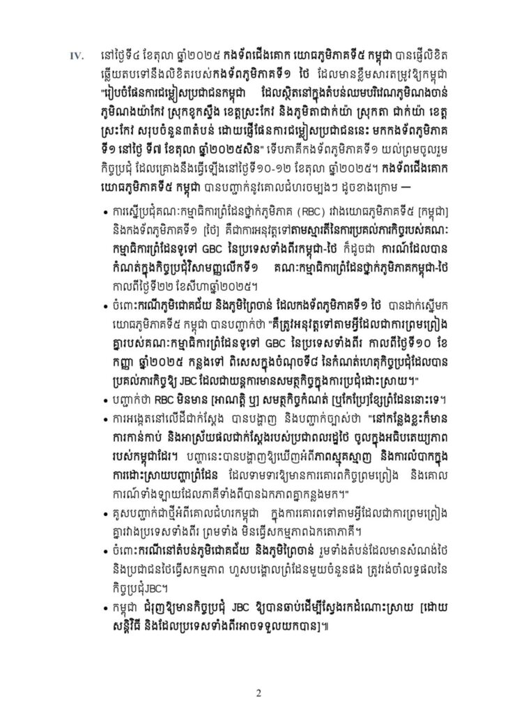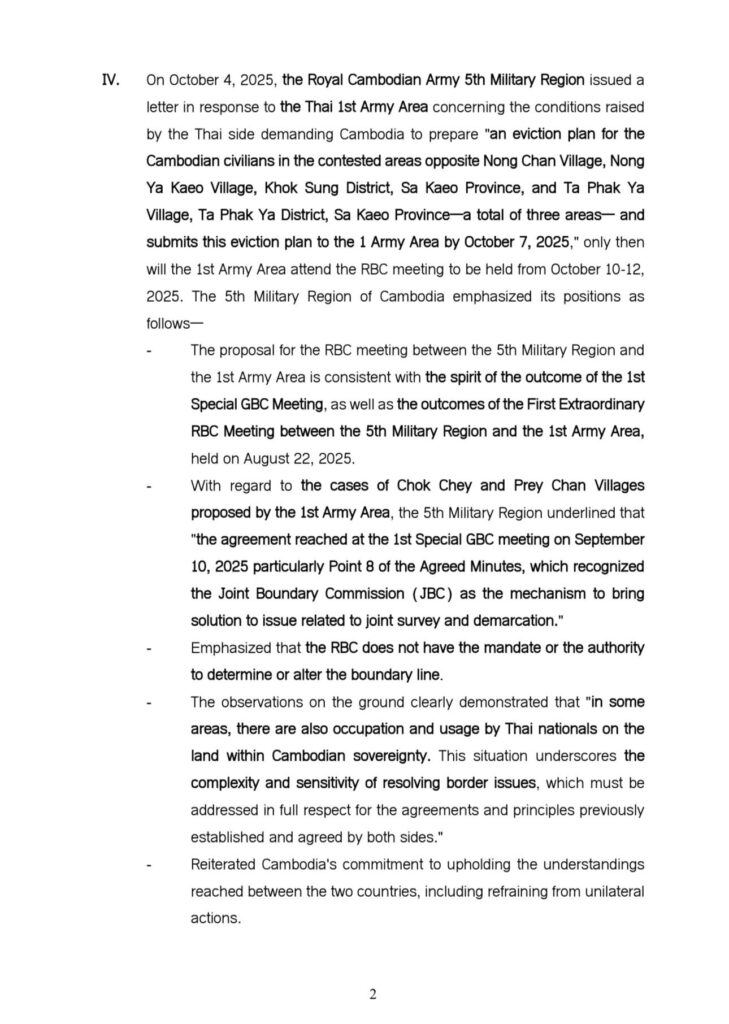 •ចំពោះករណីភូមិជោគជ័យ និងភូមិព្រៃចាន់ ដែលកងទ័ពភូមិភាគទី១ ថៃ បានដាក់ស្នើមក យោធភូមិភាគទី៥ កម្ពុជា បានបញ្ជាក់ថា “គឺត្រូវអនុវត្តទៅតាមអ្វីដែលជាការព្រមព្រៀង គ្នារបស់គណៈកម្មាធិការព្រំដែនទូទៅ GBC នៃប្រទេសទាំងពីរ កាលពីថ្ងៃទី១០ ខែ កញ្ញា ឆ្នាំ២០២៥ កន្លងទៅ ពិសេសក្នុងចំណុចទី៨ នៃកំណត់ហេតុកិច្ចប្រជុំដែលបាន ប្រគល់ភារកិច្ចឱ្យ JBC ដែលជាយន្តការមានសមត្ថកិច្ចក្នុងការប្រជុំដោះស្រាយ។”