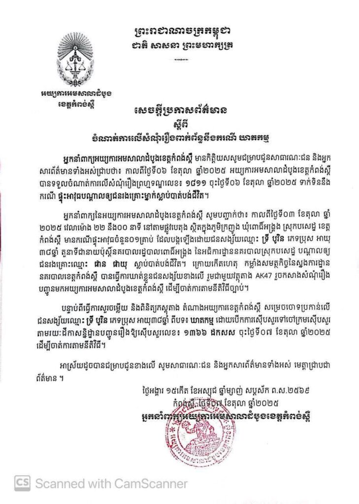 អ្នកនាំពាក្យនៃអយ្យការអមសាលាដំបូងខេត្តកំពង់ស្ពឺ សូមបញ្ជាក់ថា៖ កាលពីថ្ងៃទី០៣ ខែតុលា ឆ្នាំ ២០២៥ វេលាម៉ោង ២២ នឹង០០ នាទី នៅតាមផ្លូវបេតុង ស្ថិតក្នុងភូមិក្រញូង ឃុំពោធិ៍អង្គ្រង ស្រុកបសេដ្ឋ ខេត្ត កំពង់ស្ពឺ មានករណីផ្ទុះអាវុធចំនួន០១គ្រាប់ ដែលបង្កឡើងដោយជនសង្ស័យឈ្មោះ ទ្រី បូរិន ភេទប្រុស អាយុ ៣៨ឆ្នាំ តួនាទីជានាយប៉ុស្តិ៍នគរបាលរដ្ឋបាលពោធិ៍អង្គង នៃអធិការដ្ឋាននគរបាលស្រុកបសេដ្ឋ បណ្តាលឲ្យ ជនរងគ្រោះឈ្មោះ ផាន ផាយុ ស្លាប់បាត់បង់ជីវិត។ ក្រោយកើតហេតុ កម្លាំងសមត្ថកិច្ចនៃស្នងការដ្ឋាន នគរបាលខេត្តកំពង់ស្ពឺ បានធ្វើការឃាត់ខ្លួនជនសង្ស័យខាងលើ រួមជាមួយវត្ថុតាង AK47 រួចកសាងសំណុំរឿង បញ្ជូនមកអយ្យការអមសាលាដំបូងខេត្តកំពង់ស្ពឺ ដើម្បីចាត់ការតាមនីតិវិធីច្បាប់។