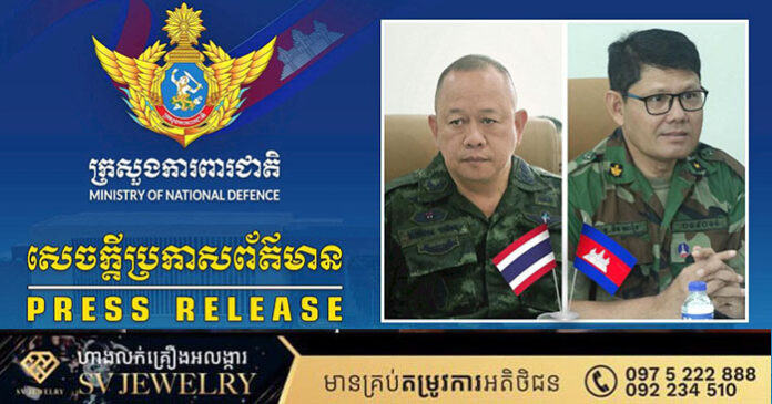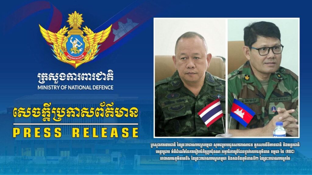ភ្នំពេញ ៖ ក្រសួងការពារជាតិ នៃព្រះរាជាណាចក្រកម្ពុជា សូមជម្រាបជូនសាធារណជន អ្នកសារព័ត៌មានជាតិ និងអន្តរជាតិមេត្តាជ្រាប អំពីដំណើរនៃការរៀបចំកិច្ចប្រជុំគណៈកម្មាធិការព្រំដែនថ្នាក់យោធភូមិភាគ កម្ពុជា-ថៃ (RBC) រវាងយោធភូមិភាគទី៤ នៃព្រះរាជាណាចក្រកម្ពុជា និងកងទ័ពភូមិភាគទី២ នៃព្រះរាជាណាចក្រថៃ។