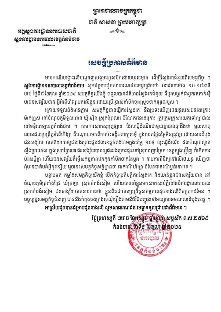 ស្នងការដា្ឋននគរបាលខេត្តកំពង់ចាម បានចេញសេចក្តីប្រកាសព័ត៍មានឲ្យដឹងថា មានករណីបង្ហោះលើបណ្តាញសង្គមហ្វេសប៊ុកដោយបុរសម្នាក់ ដើម្បីស្វែងរកជំនួយពីសមត្ថកិច្ច ។ ស្នងការដ្ឋាននគរបាលខេត្តកំពង់ចាម សូមជម្រាបជូនសាធារណជនមេត្តាជ្រាបថា នៅវេលាម៉ោង ១០:១៨នាទី យប់ ថ្ងៃទី៨ ខែតុលា ឆ្នាំ២០២៥ សមត្ថកិច្ចយើងខ្ញុំ ទទួលបានព័ត៌មានស្វែងរកជំនួយ ពីបុរសម្នាក់ជាអ្នករត់តាក់ស៊ី ថាជនសង្ស័យបានធ្វើអំពើហិង្សាមកលើខ្លួន ដោយប្រើប្រាស់កាំបិតចុងស្រួចចាក់ឲ្យរងរបួស ។