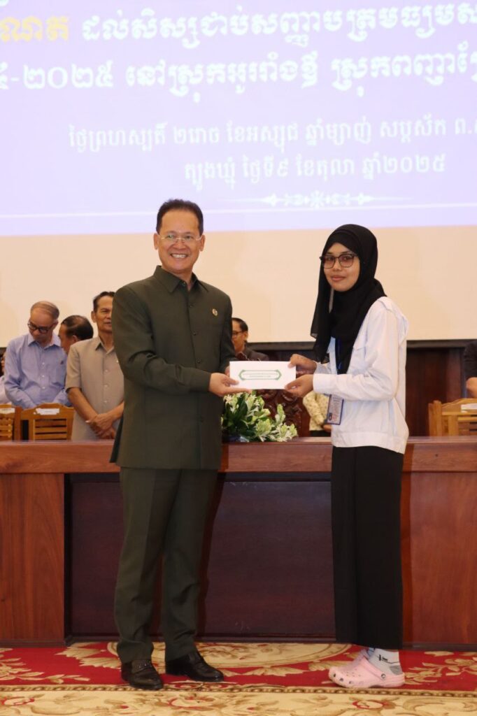 ខេត្តត្បូងឃ្មុំ៖ ឯកឧត្តមបណ្ឌិត អ៊ាង សុផល្លែត រដ្ឋមន្ត្រីក្រសួងបរិស្ថាន និងប្រធានក្រុមការងាររាជរដ្ឋាភិបាលចុះមូលដ្ឋានខេត្តត្បូងឃ្មុំ នៅព្រឹកថ្ងៃទី៩ ខែតុលា ឆ្នាំ២០២៥នេះ បានអញ្ជើញជាអធិបតីភាពដ៏ខ្ពង់ខ្ពស់ក្នុងពិធីជួបសំណេះសំណាល និងនាំយកអំណោយដ៏ថ្លៃថ្លារបស់សម្តេចមហាបវរធិបតី ហ៊ុន ម៉ាណែត នាយករដ្ឋមន្ត្រី នៃព្រះរាជាណាចក្រកម្ពុជា និងលោកជំទាវ ពេជ ចន្ទមុន្នី ហ៊ុនម៉ាណែត លើកទឹកចិត្តជូនដល់សិស្សានុសិស្ស ជ័យលាភី ជាប់សញ្ញាបត្រមធ្យមសិក្សាទុតិយភូមិ ឆ្នាំសិក្សា ២០២៤-២០២៥ សម័យឡង ថ្ងៃទី២៨សីហា ដែលបានប្រឡងជាប់និទ្ទេស A-E មកពីស្រុកអូររាំងឪ ស្រុកពញាក្រែក និងស្រុកត្បូងឃ្មុំ ក្នុងខេត្តត្បូងឃ្មុំ។