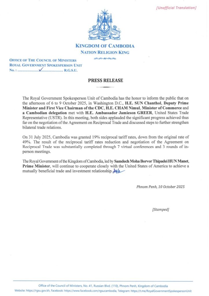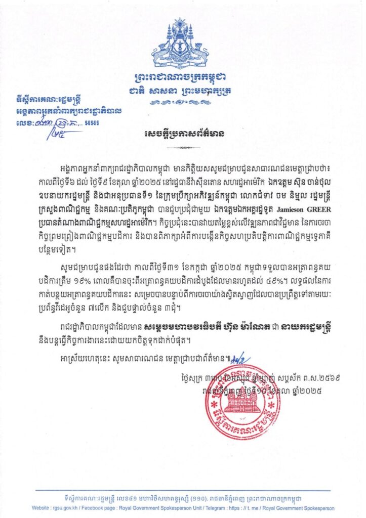 រាជធានីភ្នំពេញ ៖ ថ្ងៃទី១០ ខែតុលា ឆ្នាំ២០២៥ អង្គភាពអ្នកនាំពាក្យរាជរដ្ឋាភិបាលកម្ពុជា សូមជម្រាបជូនសាធារណជនមេត្តាជ្រាបថា៖ កាលពីថ្ងៃទី៦ ដល់ ថ្ងៃទី៩ ខែតុលា ឆ្នាំ២០២៥ នៅរដ្ឋធានីវ៉ាស៊ីនតោន សហរដ្ឋអាម៉េរិក ឯកឧត្តម ស៊ុន ចាន់ថុល ឧបនាយករដ្ឋមន្ត្រី និងជាអនុប្រធានទី១ នៃក្រុមប្រឹក្សាអភិវឌ្ឍន៍កម្ពុជា លោកជំទាវ ចម និម្មល រដ្ឋមន្តី ក្រសួងពាណិជ្ជកម្ម និងគណៈប្រតិភូកម្ពុជា បានជួបប្រជុំជាមួយ ឯកឧត្តមឯកអគ្គរដ្ឋទូត Jamieson GREER ប្រធានតំណាងពាណិជ្ជកម្មសហរដ្ឋអាម៉េរិក។
