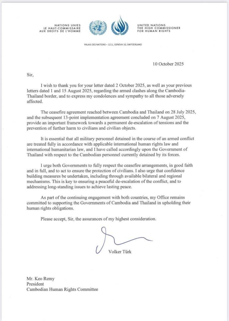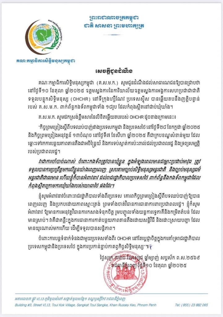 ថ្ងៃទី១០ ខែតុលា ឆ្នាំ២០២៥ គណៈកម្មាធិការសិទ្ធិមនុស្សកម្ពុជា (គ.ស.ម.ក.) សូមជូនដំណឹងដល់សាធារណជនឱ្យបានជ្រាបថា នៅថ្ងៃទី១០ ខែតុលា ឆ្នាំ២០២៥ ឧត្តមស្នងការនៃការិយាល័យឧត្តមស្នងការអង្គការសហប្រជាជាជាតិ ទទួលបន្ទុកសិទ្ធិមនុស្ស (OHCHR) នៅទីក្រុងហ្សឺណែវ ប្រទេសស្វ៊ីស បានឆ្លើយតបនឹងញត្តិបន្ទាន់ របស់ គ.ស.ម.ក. ពាក់ព័ន្ធកងទ័ពកម្ពុជាទាំង ១៨រូប ដែលកំពុងស្ថិតនៅជាប់ឃុំឃាំង។