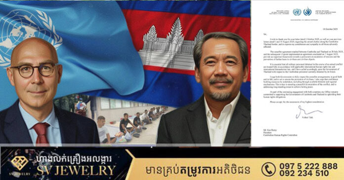 ភ្នំពេញ ៖ ក្នុងការឆ្លើយតបរបស់ឧត្តមស្នងការនៃការិយាល័យឧត្តមស្នងការអង្គការសហប្រជាជាជាតិ ទទួលបន្ទុកសិទ្ធិមនុស្ស (OHCHR) ឯកឧត្តម Volker Türk បានបញ្ជាក់ថា កងទ័ពរបស់កម្ពុជាទាំង១៨នាក់ ដែលត្រូវបានឃុំខ្លួន ត្រូវបានទទួលការថែទាំយ៉ាងពេញលេញ ស្របតាមច្បាប់សិទ្ធិមនុស្សអន្តរជាតិ និងច្បាប់មនុស្សធម៌អន្តរជាតិជាធរមាន ព្រមទាំងបានអំពាវនាវ ដល់រាជរដ្ឋាភិបាលប្រទេសថៃ ពាក់ព័ន្ធនឹងកងទ័ពកម្ពុជាដែលកំពុងស្ថិតក្រោមការឃុំឃាំងរបស់យោធាថៃ ផងដែរ។