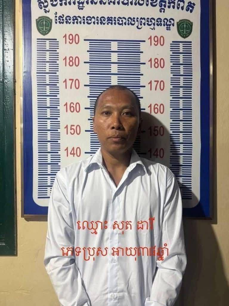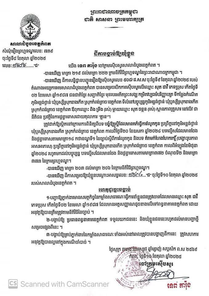 កំពត ៖ លោក ទេព តារ៉ុង ចៅក្រមស៊ើបសួរសាលាដំបូងខេត្តកំពត នៅថ្ងៃទី១០ ខែតុលា ឆ្នាំ២០២៥ បានចេញដីកាបង្គាប់ឱ្យឃុំខ្លួនឈ្មោះ សុត ដាវី អតីតព្រះគ្រូចៅអធិការវត្តភ្នំរាប ក្រោយមានរឿងអធិករជាមួយស្រី។