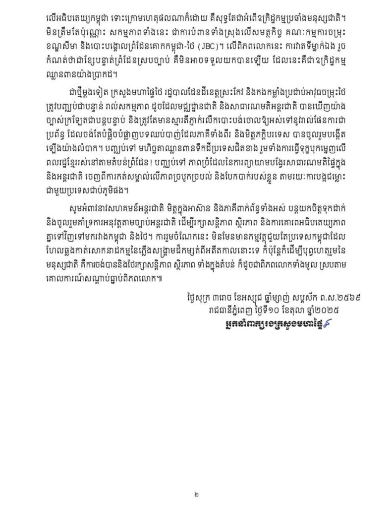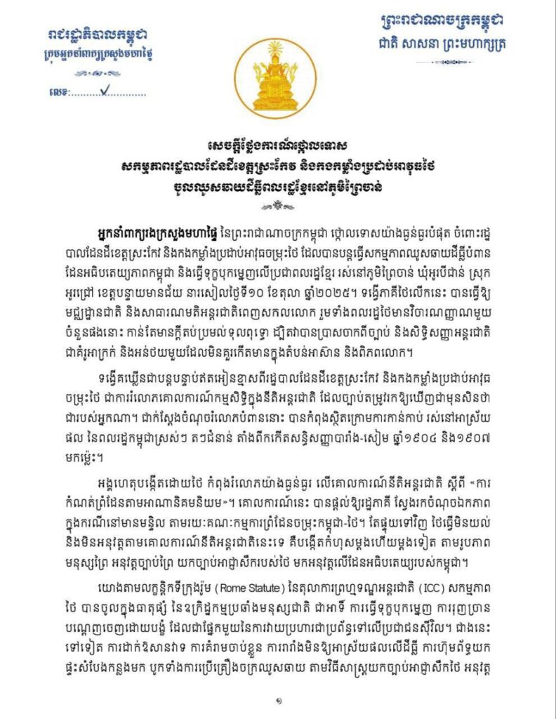 ជាថ្មីម្ដងទៀត ក្រសួងមហាផ្ទៃថៃ រដ្ឋបាលដែនដីខេត្តស្រះកែវ និងកងកម្លាំងប្រដាប់អាវុធចម្រុះថៃ ត្រូវបញ្ឈប់ជាបន្ទាន់ រាល់សកម្មភាព ដូចដែលមជ្ឈដ្ឋានជាតិ និងសាធារណមតិអន្តរជាតិ បានឃើញយ៉ាង ច្បាស់ក្រឡែតជាបន្តបន្ទាប់ និងត្រូវតែមានស្មារតីភ្ញាក់រលឹកបោះបង់ចោលឱ្យអស់ទៅនូវរាល់ផែនការជា ប្រព័ន្ធ ដែលចង់តែបំផ្លិចបំផ្លាញបទឈប់បាញ់ដែលភាគីទាំងពីរ និងមិត្តភក្តិបរទេស បានចូលរួមបង្កើត ឡើងយ៉ាងលំបាក។ បញ្ឈប់ទៅ មហិច្ឆតាឈ្លានពានទឹកដីប្រទេសជិតខាង រួមទាំងការធ្វើទុក្ខបុកម្នេញលើ ពលរដ្ឋខ្មែររស់នៅតាមតំបន់ព្រំដែន! បញ្ឈប់ទៅ ភាពច្រំដែលនៃការព្យាយាមបង្វែរសាធារណមតិផ្ទៃក្នុង និងអន្តរជាតិ ចេញពីការកត់សម្គាល់លើភាពច្របូកច្របល់ និងបែកបាក់របស់ខ្លួន តាមរយៈការបង្កជម្លោះ ជាមួយប្រទេសជាប់ភូមិផង។