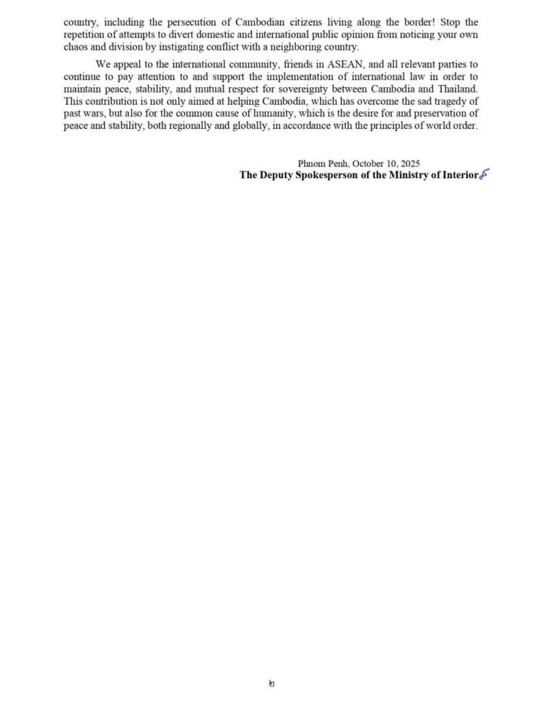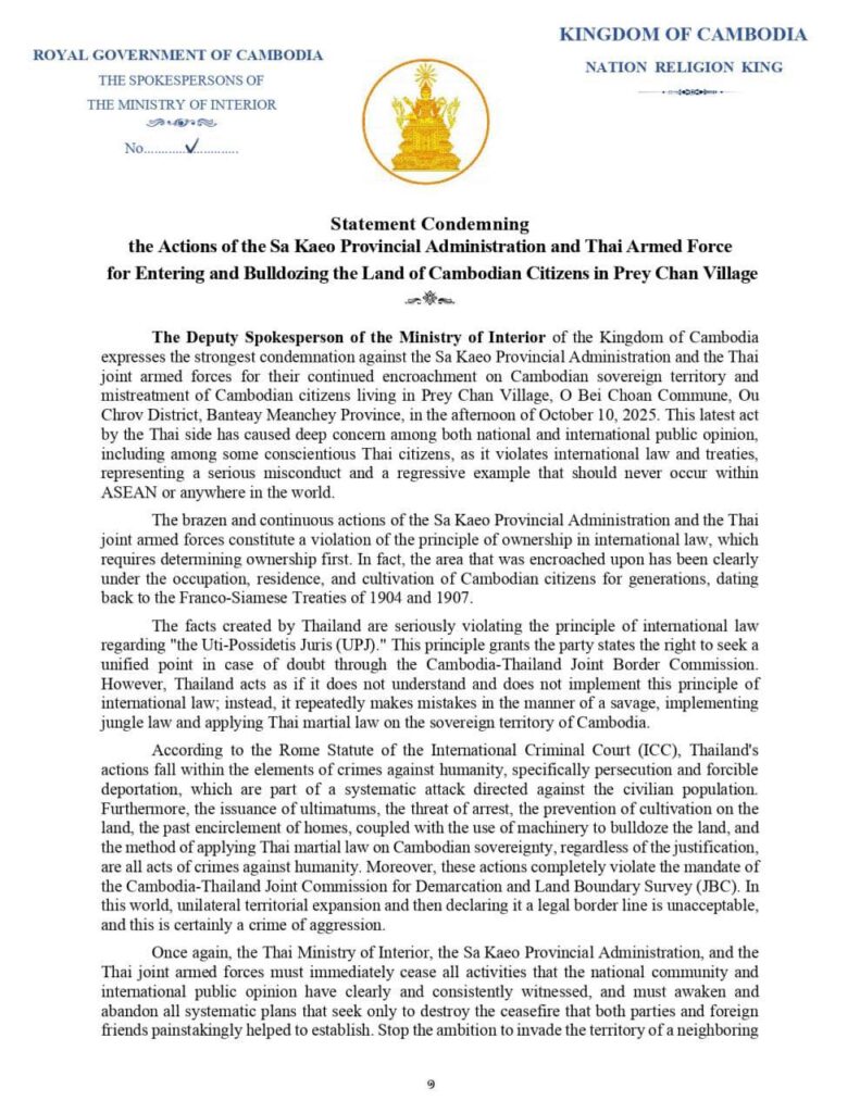 អ្នកនាំពាក្យរងក្រសួងមហាផ្ទៃ នៃព្រះរាជាណាចក្រកម្ពុជា ថ្កោលទោសយ៉ាងធ្ងន់ធ្ងរបំផុត ចំពោះរដ្ឋបាលដែនដីខេត្តស្រះកែវ និងកងកម្លាំងប្រដាប់អាវុធចម្រុះថៃ ដែលបានបន្តធ្វើសកម្មភាពឈូសឆាយដីធ្លីបំពាន ដែនអធិបតេយ្យភាពកម្ពុជា និងធ្វើទុក្ខបុកម្នេញលើប្រជាពលរដ្ឋខ្មែរ រស់នៅភូមិព្រៃចាន់ ឃុំអូរបីជាន់ ស្រុក អូរជ្រៅ ខេត្តបន្ទាយមានជ័យ នារសៀលថ្ងៃទី១០ ខែតុលា ឆ្នាំ២០២៥។ ទង្វើភាគីថៃលើកនេះ បានធ្វើឱ្យ មជ្ឈដ្ឋានជាតិ និងសាធារណមតិអន្តរជាតិពេញសកលលោក រួមទាំងពលរដ្ឋថៃមានវិចារណញ្ញាណមួយ ចំនួនផងនោះ កាន់តែមានក្តីតប់ប្រមល់ទុលពុទ្ធោ ដ្បិតវាបានប្រាសចាកពីច្បាប់ និងសិទ្ធិសញ្ញាអន្តរជាតិ ជាគំរូអាក្រក់ និងអន់ថយមួយដែលមិនគួរកើតមានក្នុងតំបន់អាស៊ាន និងពិភពលោក។