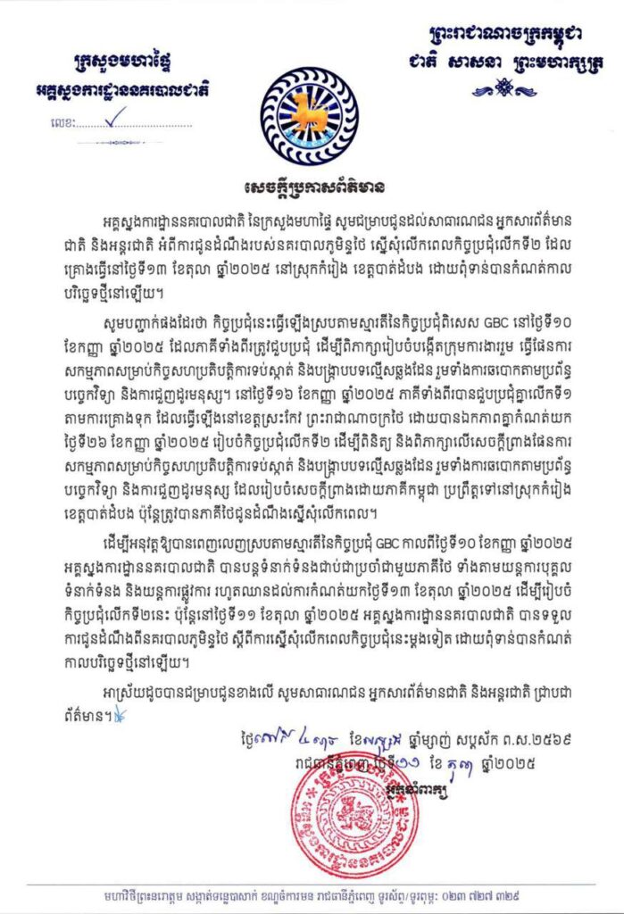 អគ្គស្នងការដ្ឋាននគរបាលជាតិ ចេញសេចក្តីប្រកាសព័ត៌មាន អំពីការជូនដំណឹងរបស់នគរបាលភូមិន្ទថៃ ស្នើសុំលើកពេលកិច្ចប្រជុំលើកទី២ ដែលគ្រោងធ្វើនៅថ្ងៃទី១៣ ខែតុលា ឆ្នាំ២០២៥ នៅស្រុកកំរៀង ខេត្តបាត់ដំបង ដោយពុំទាន់បានកំណត់កាលបរិច្ឆេទថ្មីនៅឡើយ។
