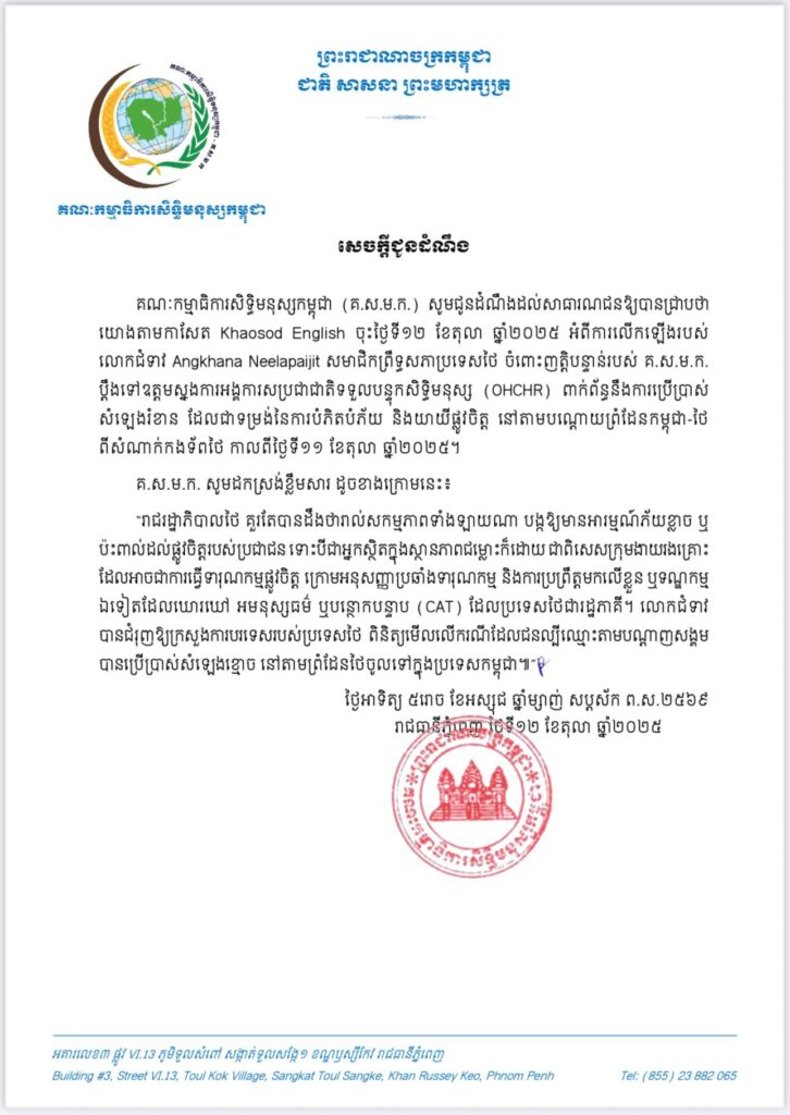 គណៈកម្មាធិការសិទ្ធិមនុស្សកម្ពុជា (គ.ស.ម.ក.) ចេញសេចក្តីជូនដំណឹង អំពីការលើកឡើងរបស់ លោកជំទាវ Angkhana Neelapaijit សមាជិកព្រឹទ្ធសភាប្រទេសថៃ ចំពោះញត្តិបន្ទាន់របស់ គ.ស.ម.ក. ប្តឹងទៅឧត្តមស្នងការអង្គការសប្រជាជាតិទទួលបន្ទុកសិទ្ធិមនុស្ស (OHCHR) ពាក់ព័ន្ធនឹងការប្រើប្រាស់ សំឡេងរំខាន ដែលជាទម្រង់នៃការបំភិតបំភ័យ និងយាយីផ្លូវចិត្ត នៅតាមបណ្តោយព្រំដែនកម្ពុជា-ថៃ ពីសំណាក់កងទ័ពថៃ កាលពីយប់ថ្ងៃទី១១ ខែតុលា ឆ្នាំ២០២៥។