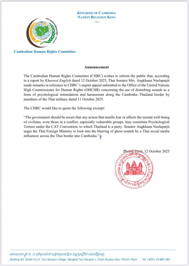 ថ្ងៃទី១២ ខែតុលា ឆ្នាំ២០២៥ គណៈកម្មាធិការសិទ្ធិមនុស្សកម្ពុជា (គ.ស.ម.ក.) សូមជូនដំណឹងដល់សាធារណជនឱ្យបានជ្រាបថា យោងតាមកាសែត Khaosod English ចុះថ្ងៃទី១២ ខែតុលា ឆ្នាំ២០២៥ អំពីការលើកឡើងរបស់ លោកជំទាវ Angkhana Neelapaijit សមាជិកព្រឹទ្ធសភាប្រទេសថៃ ចំពោះញត្តិបន្ទាន់របស់ គ.ស.ម.ក. ប្តឹងទៅឧត្ដមស្នងការអង្គការសប្រជាជាតិទទួលបន្ទុកសិទ្ធិមនុស្ស (OHCHR) ពាក់ព័ន្ធនឹងការប្រើប្រាស់ សំឡេងរំខាន ដែលជាទម្រង់នៃការបំភិតបំភ័យ និងយាយីផ្លូវចិត្ត នៅតាមបណ្ដោយព្រំដែនកម្ពុជា-ថ ពីសំណាក់កងទ័ពថៃ កាលពីថ្ងៃទី១១ ខែតុលា ឆ្នាំ២០២៥។