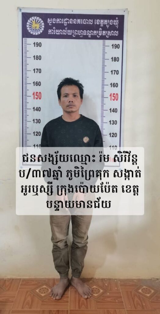 ៣. ឈ្មោះ រ៉ម សិរីវ័ន្ត ភេទប្រុស អាយុ៣៧ឆ្មាំ ជនជាតិខ្មែរ រស់នៅភូមិព្រៃកុប សង្កាត់ផ្សារអូរទស្សី ក្រុងប៉ោយប៉ែត ខេត្តបន្ទាយមានជ័យ