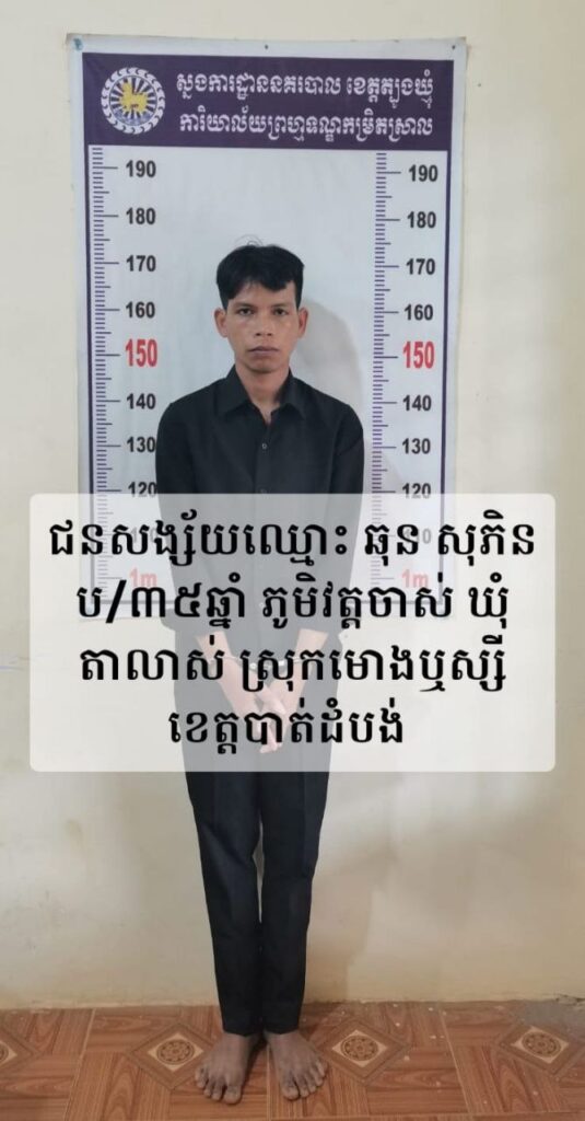៤. ឈ្មោះ ឆុន សុភិន ភេទប្រុស អាយុ៣៥ឆ្នាំ ជនជាតិខ្មែររ ស់នៅភូមិវត្តចាស់ ឃុំតាលាស់ ស្រុកមោងឬស្សី ខេត្តបាត់ដំបង។