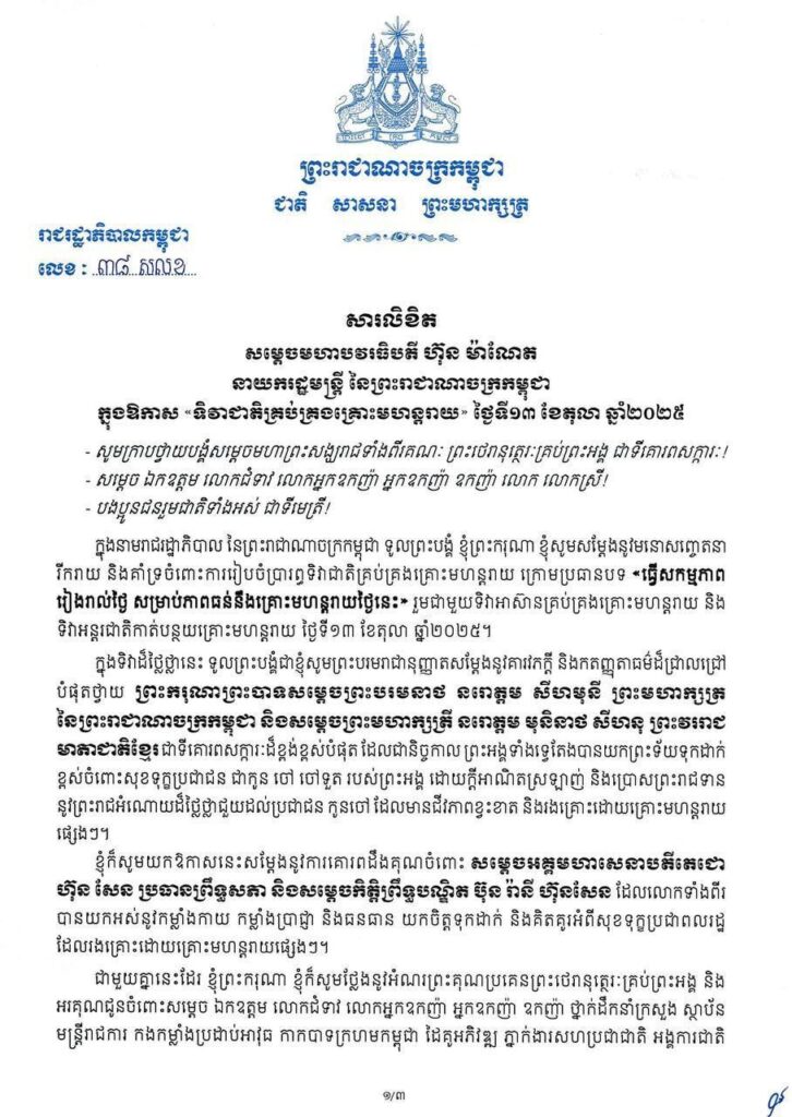 ភ្នំពេញ ៖ សម្ដេចមហាបវរធិបតី ហ៊ុន ម៉ាណែត នាយករដ្ឋមន្ត្រី នៃព្រះរាជាណាចក្រកម្ពុជា បានចេញសារលិខិត