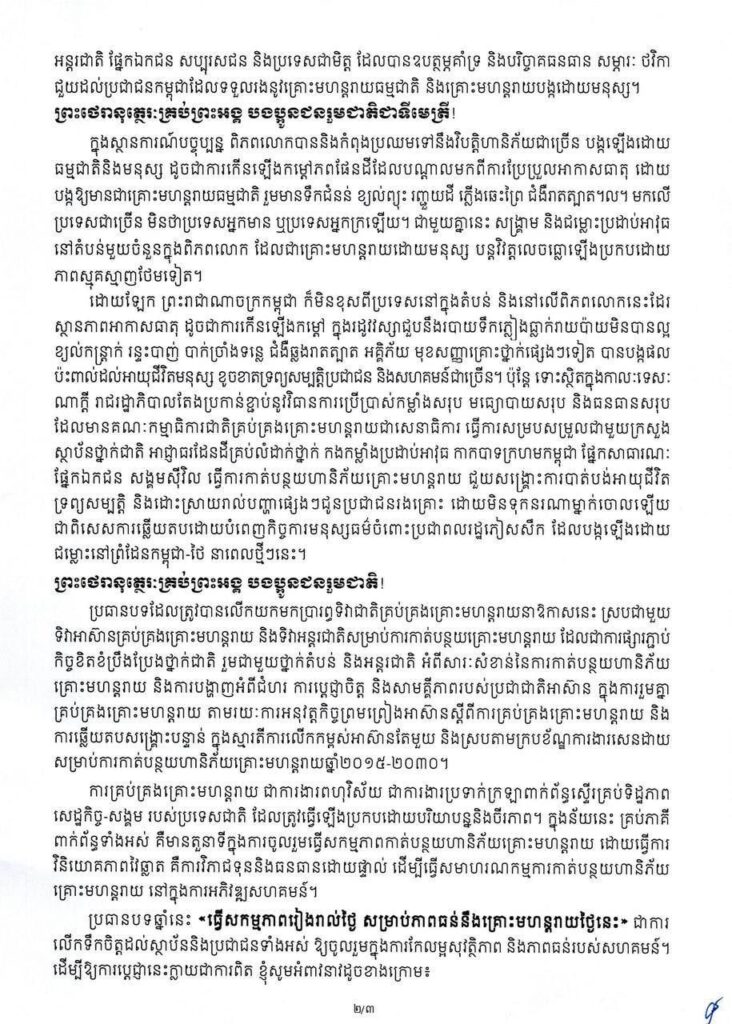ដោយឡែក ព្រះរាជាណាចក្រកម្ពុជា ក៏មិនខុសពីប្រទេសនៅក្នុងតំបន់ និងនៅលើពិភពលោកនេះដែរ ស្ថានភាពអាកាសធាតុ ដូចជាការកើនឡើងកម្ដៅ ក្នុងរដូវវស្សាជួបនឹងរបាយទឹកភ្លៀងធ្លាក់រាយប៉ាយមិនបានល្អ ខ្យល់កន្ត្រាក់ រន្ទះបាញ់ បាក់ច្រាំងទន្លេ ជំងឺឆ្លងរាតត្បាត អគ្គិភ័យ មុខសញ្ញាគ្រោះថ្នាក់ផ្សេងៗទៀត បានបង្កផល ប៉ះពាល់ដល់អាយុជីវិតមនុស្ស ខូចខាតទ្រព្យសម្បត្តិប្រជាជន និងសហគមន៍ជាច្រើន។ ប៉ុន្តែ ទោះស្ថិតក្នុងកាលៈទេសៈ ណាក្តី រាជរដ្ឋាភិបាលតែងប្រកាន់ខ្ជាប់នូវវិធានការប្រើប្រាស់កម្លាំងសរុប មធ្យោបាយសរុប និងធនធានសរុប ដែលមានគណៈកម្មាធិការជាតិគ្រប់គ្រងគ្រោះមហន្តរាយជាសេនាធិការ ធ្វើការសម្របសម្រួលជាមួយក្រសួង ស្ថាប័នថ្នាក់ជាតិ អាជ្ញាធរដែនដីគ្រប់លំដាក់ថ្នាក់ កងកម្លាំងប្រដាប់អាវុធ កាកបាទក្រហមកម្ពុជា ផ្នែកសាធារណៈ ផ្នែកឯកជន សង្គមស៊ីវិល ធ្វើការកាត់បន្ថយហានិភ័យគ្រោះមហន្តរាយ ជួយសង្គ្រោះការបាត់បង់អាយុជីវិត ទ្រព្យសម្បត្តិ និងដោះស្រាយរាល់បញ្ហាផ្សេងៗជូនប្រជាជនរងគ្រោះ ដោយមិនទុកនរណាម្នាក់ចោលឡើយ ជាពិសេសការឆ្លើយតបដោយបំពេញកិច្ចការមនុស្សធម៌ចំពោះប្រជាពលរដ្ឋភៀសសឹក ដែលបង្កឡើងដោយ ជម្លោះនៅព្រំដែនកម្ពុជា-ថៃ នាពេលថ្មីៗនេះ។