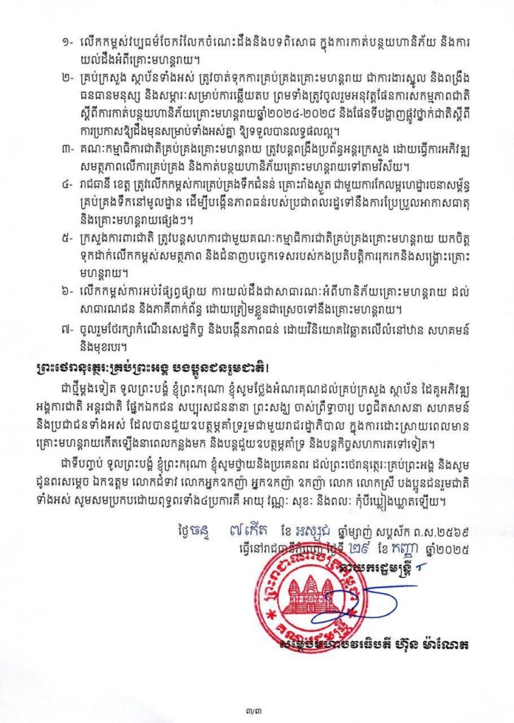 ២- គ្រប់ក្រសួង ស្ថាប័នទាំងអស់ ត្រូវចាត់ទុកការគ្រប់គ្រងគ្រោះមហន្តរាយ ជាការងារស្នូល និងពង្រឹង ធនធានមនុស្ស និងសម្ភារៈសម្រាប់ការឆ្លើយតប ព្រមទាំងត្រូវចូលរួមអនុវត្តផែនការសកម្មភាពជាតិ ស្តីពីការកាត់បន្ថយហានិភ័យគ្រោះមហន្តរាយឆ្នាំ២០២៤-២០២៨ និងផែនទីបង្ហាញផ្លូវថ្នាក់ជាតិស្តីពី