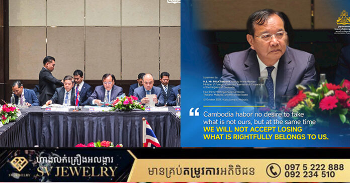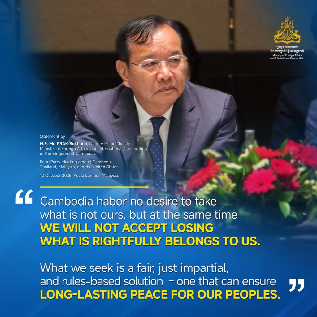 នៅថ្ងៃទី ១២ ខែតុលា ឆ្នាំ ២០២៥ ឯកឧត្តមឧបនាយករដ្ឋមន្ត្រី ប្រាក់ សុខុន រដ្ឋមន្ត្រីការបរទេស និងសហប្រតិបត្តិការអន្តរជាតិ បានអញ្ជើញចូលរួមកិច្ចប្រជុំចតុភាគី រវាងប្រទេសកម្ពុជា ថៃ ម៉ាឡេស៊ី និងសហរដ្ឋអាមេរិក តាមការអញ្ជើញរបស់ឯកឧត្តម Dato’ Seri Anwar Bin Ibrahim នាយករដ្ឋមន្រ្តីនៃប្រទេសម៉ាឡេស៊ី។ អង្គប្រជុំបានបង្ហាញពីបំណងប្រាថ្នារួម ដើម្បីសន្តិភាព និងស្ថិរភាពរវាងកម្ពុជានិងថៃ ក៏ដូចជានៅក្នុងតំបន់ទាំងមូល។ ការណ៍នេះបានបញ្ជាក់ជាថ្មីនូវការប្តេជ្ញាចិត្តយ៉ាងមុតមាំក្នុងការដោះស្រាយជម្លោះដោយសន្តិវិធី ការមិនប្រើកម្លាំង និងការគោរពច្បាប់អន្តរជាតិ។