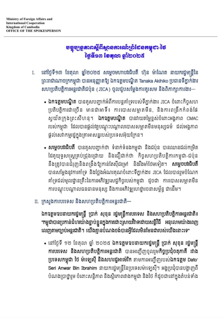 ភ្នំពេញ ៖ ក្រសួងការបរទេសនិងសហប្រតិបត្តិការអន្តរជាតិ បានចេញរបាយការណ៍ស្តីពីបច្ចុប្បន្នភាពស្តីពីស្ថានការណ៍ព្រំដែនកម្ពុជា-ថៃ ថ្ងៃទី១៣ ខែតុលា ឆ្នាំ២០២៥។
