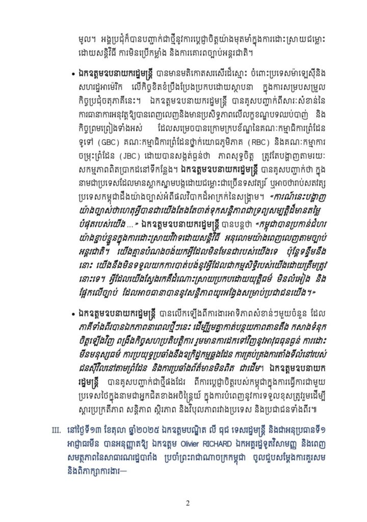 យើងគ្មានបំណងចង់យកអ្វីដែលមិនមែនជារបស់យើងទេ ប៉ុន្តែទន្ទឹមនឹង នោះ យើងនឹងមិនទទួលយកការបាត់បង់នូវអ្វីដែលជាកម្មសិទ្ធិរបស់យើងដោយត្រឹមត្រូវ នោះទេ។ អ្វីដែលយើងស្វែងរកគឺដំណោះស្រាយប្រកបដោយយុត្តិធម៌ មិនលំអៀង និង ផ្អែកលើច្បាប់ ដែលអាចធានាបាននូវសន្តិភាពយូរអង្វែងសម្រាប់ប្រជាជនយើង។» ឯកឧត្តមឧបនាយករដ្ឋមន្ត្រី បានលើកឡើងពីការងារអាទិភាពសំខាន់ៗមួយចំនួន ដែល ភាគីទាំងពីរបានឯកភាពនាពេលថ្មីៗនេះ ដើម្បីរួមគ្នាកាត់បន្ថយភាពតានតឹង កសាងទំនុក ចិត្តឡើងវិញ ពង្រឹងកិច្ចសហប្រតិបត្តិការ រួមមានការដកទៅវិញនូវអាវុធធុនធ្ងន់ ការដោះ មីនមនុស្សធម៌ ការប្រយុទ្ធប្រឆាំងនឹងឧក្រិដ្ឋកម្មឆ្លងដែន ការគ្រប់គ្រងការតាំងទីលំនៅរបស់ ជនស៊ីវិលនៅតាមព្រំដែន និងការប្រឆាំងព័ត៌មានមិនពិត ជាដើម ។ ឯកឧត្តមឧបនាយក រដ្ឋមន្ត្រី បានគូសបញ្ជាក់ជាថ្មីផងដែរ ពីការប្តេជ្ញាចិត្តរបស់កម្ពុជាក្នុងការធ្វើការជាមួយ ប្រទេសថៃក្នុងនាមជាអ្នកជិតខាងអចិន្ត្រៃយ៍ ក្នុងការបំពេញនូវការទទួលខុសត្រូវរួមដើម្បី ស្តារប្រក្រតីភាព សន្តិភាព ស្ថិរភាព និងវិបុលភាពរវាងប្រទេស និងប្រជាជនទាំងពីរ។